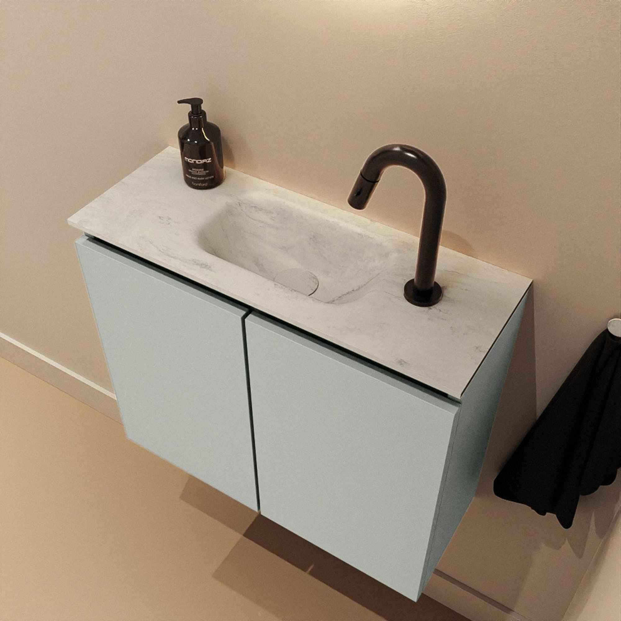 Vous recherchez un meuble compact et moderne pour faire de vos toilettes ou de votre petite salle de bains un ensemble vraiment stylé, sans pour autant sacrifier l’espace de circulation ? Ce meuble WC compact aux dimensions fines est alors un choix judicieux. Grâce à sa faible profondeur, il s’intègre sans effort dans les toilettes étroites et les petites salles de bains, tout en vous offrant un véritable lavabo. La combinaison d’une couleur de meuble vert-gris moderne avec un élégant lavabo en solid surface aspect marbre s’harmonise parfaitement avec les intérieurs contemporains, du style moderne épuré au scandinave et à l’hôtel chic. Grâce au trou de robinet central, vous pouvez facilement choisir un petit robinet de lave-mains qui s’accorde avec le reste de vos équipements sanitaires. Vous créez ainsi une allure calme et réfléchie, même dans la plus petite pièce de la maison.