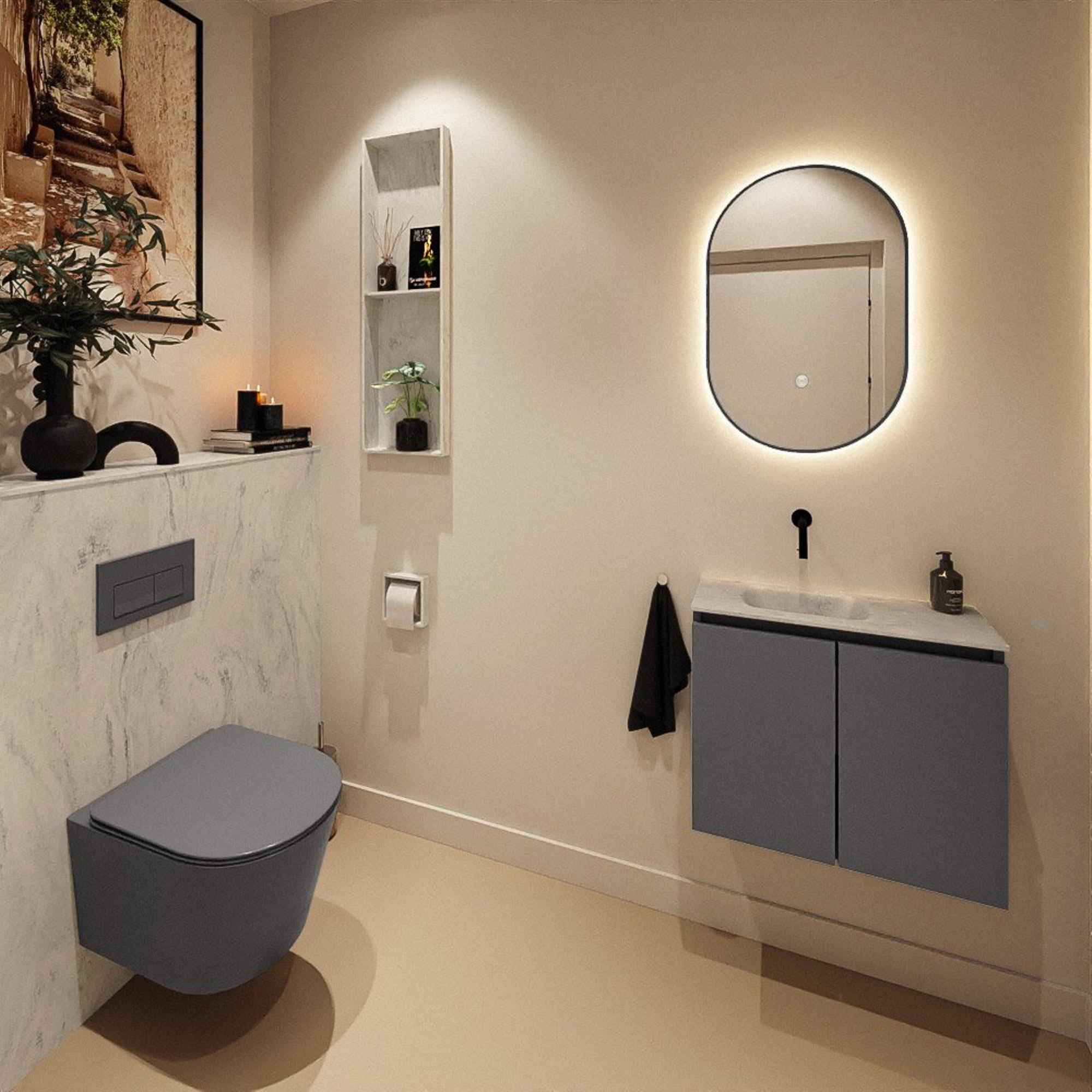 Avec une largeur de 60 cm et une profondeur de seulement 23 cm, ce meuble est spécialement conçu pour les petites toilettes et salles de bains où chaque centimètre compte. La faible profondeur évite que le meuble ne dépasse trop, de sorte que votre espace de circulation soit préservé et que la pièce paraisse visuellement plus grande. Dans le même temps, la largeur offre une surface de lavabo suffisante pour se laver les mains confortablement. Le lavabo positionné à gauche assure une disposition logique lorsque, par exemple, la porte s’ouvre d’un côté ou lorsque vous souhaitez conserver de la place de l’autre côté pour une brosse de toilettes, une poubelle ou de la décoration. Vous tirez ainsi le maximum de votre espace toilettes, sans rien sacrifier en termes de confort ou d’esthétique.
