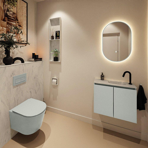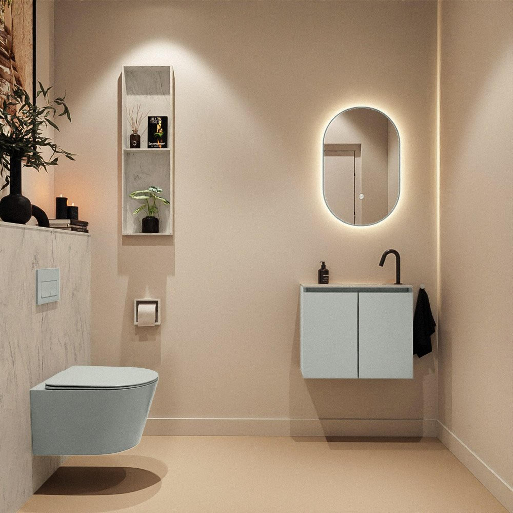 Avec des dimensions de 60 x 23 x 50 cm, ce meuble est clairement conçu pour les espaces compacts. La faible profondeur permet de préserver l’espace de circulation dans vos toilettes, tout en disposant d’un point d’eau pratique. Comme le meuble est monté suspendu, le sol paraît plus spacieux et le nettoyage reste simple. La vasque est positionnée à droite avec le trou de robinet également à droite, ce qui est parfait si, par exemple, vous avez un mur à gauche ou si la porte s’ouvre d’un côté. Vous exploitez ainsi au maximum l’espace disponible, sans faire de compromis sur le confort ou l’esthétique.