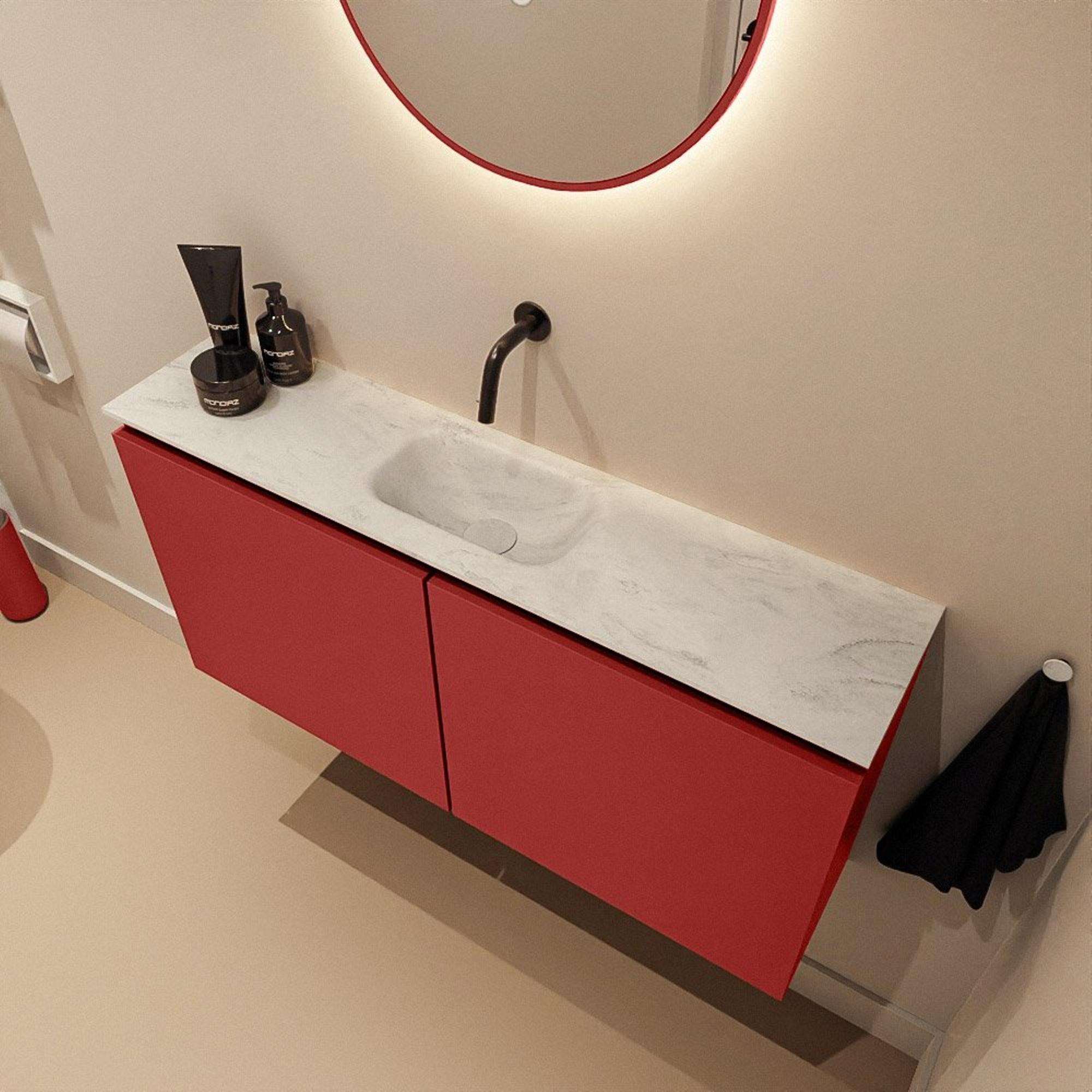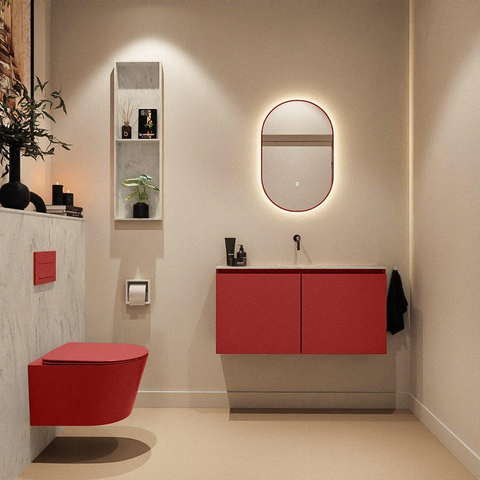 Le meuble est réalisé en MDF dans la couleur Fire, une teinte rouge chaude qui apporte immédiatement du caractère à votre pièce. Cette couleur fonctionne à merveille comme élément accrocheur sur un mur carrelé sobre, mais se marie aussi très bien avec des accessoires noirs, dorés ou chromés. Derrière les deux portes, vous rangez facilement rouleaux de papier toilette, produits d’entretien ou serviettes invitées à l’abri des regards, afin que vos toilettes aient toujours l’air soignées. Le MDF convient pour une utilisation dans la salle de bains, à condition que le meuble soit correctement monté et bénéficie d’une bonne ventilation. Grâce à la finition sans poignées, vous ouvrez les portes facilement via un joint discret, ce qui renforce l’allure moderne et épurée. Vous combinez ainsi un design marquant avec un espace de rangement pratique dans un seul meuble compact.