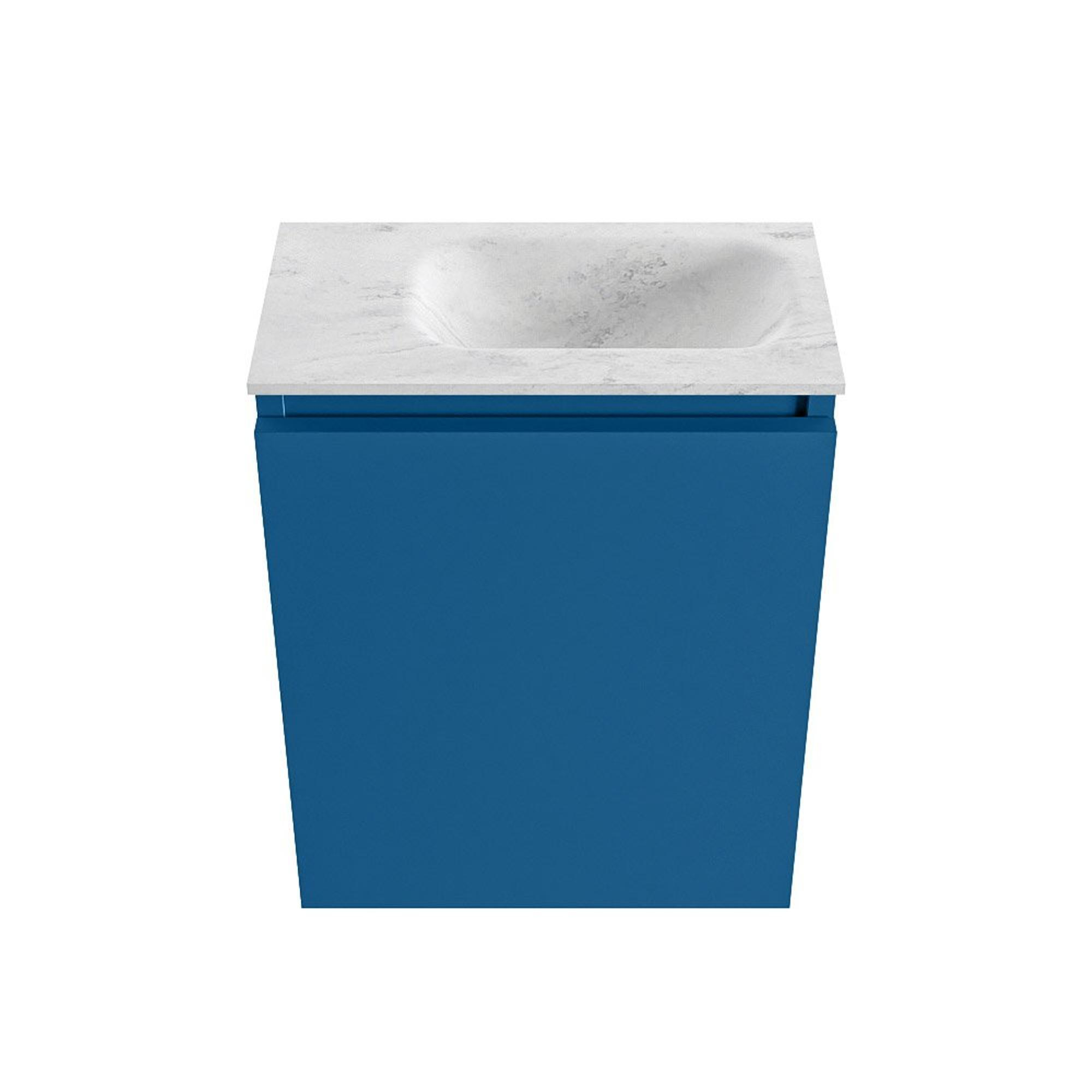 La couleur jeans du caisson apporte une touche contemporaine à vos toilettes : un peu différente du blanc ou du gris standard, mais néanmoins facile à associer avec des carreaux clairs, de la robinetterie noire ou des accents en bois. Le meuble en MDF s'intègre parfaitement dans les salles de bains modernes et scandinaves. Le lavabo de couleur Opalo est fabriqué en solid surface, un matériau réputé pour son aspect lisse et sans joints apparents ainsi que pour sa qualité haut de gamme. La combinaison du meuble bleu avec le plan gris-blanc doux est raffinée et élégante. Comme le lavabo n'a pas de trou de robinet, vous pouvez choisir vous-même un mitigeur de fontaine encastré dans le mur assorti, ce qui apporte une allure encore plus luxueuse, digne d'un hôtel, et plus de liberté dans votre conception.