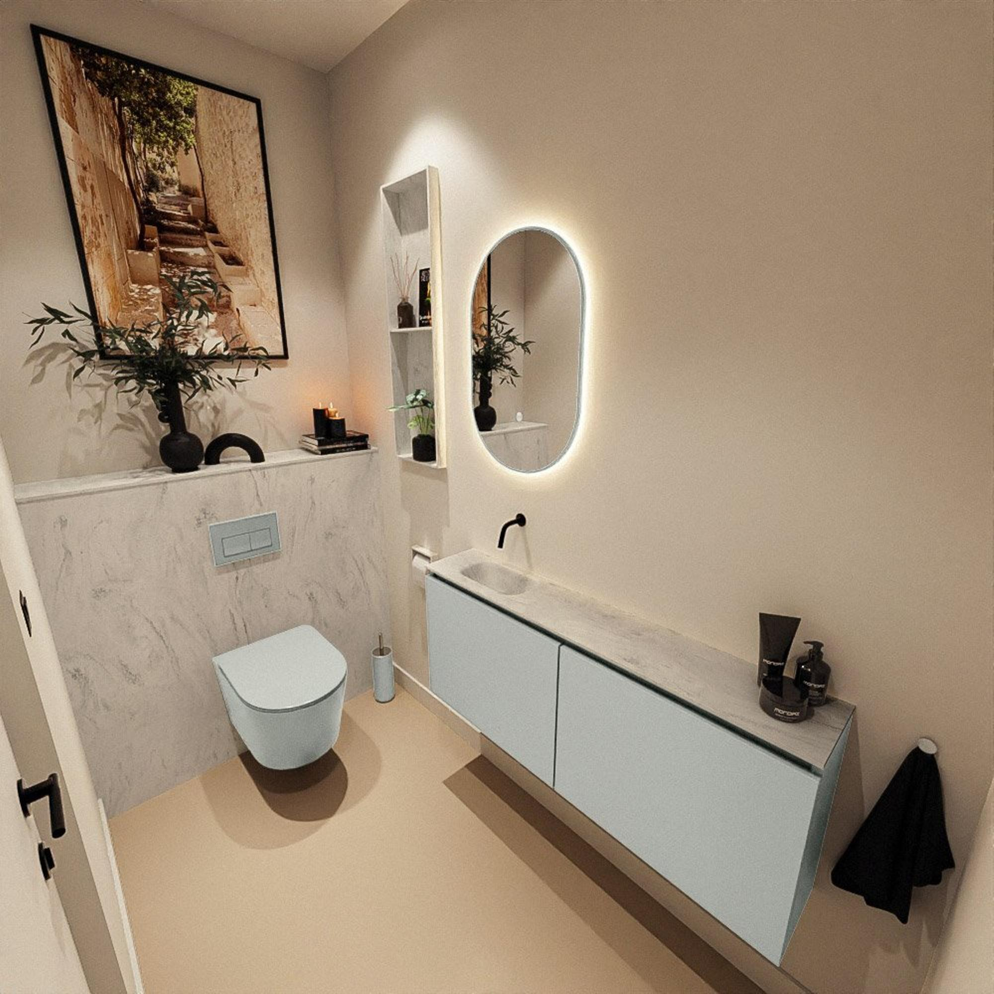 Ce meuble WC plat et épuré est idéal si vous souhaitez donner à vos toilettes une apparence moderne et luxueuse sans que l’ensemble paraisse chargé. Grâce à la profondeur limitée, il reste beaucoup d’espace de circulation, ce qui est appréciable dans les toilettes petites ou étroites. La combinaison du meuble fin avec un lavabo sans joints en solid surface offre un aspect calme et extrêmement soigné. La teinte gris-vert s’accorde parfaitement avec les tendances de carrelage populaires telles que l’effet béton, l’effet marbre ou au contraire les tons chauds de terre. Si vous aimez un style moderne et intemporel avec une grande praticité, ce meuble constitue une base intelligente pour aménager vos toilettes de manière à la fois élégante et fonctionnelle.