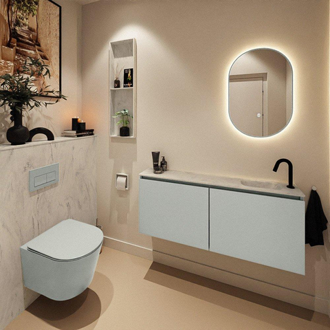 La couleur vert greige donne immédiatement à vos toilettes une apparence contemporaine et raffinée. La façade est sans poignées, ce qui donne à l’ensemble un aspect plat et apaisant, parfaitement en accord avec un style de salle de bains minimaliste ou scandinave. Grâce à la largeur généreuse de 120 cm, le meuble prend tout son sens sur un grand mur de toilettes ou de salle de bains et vous créez une ambiance luxueuse digne d’un hôtel. La position du lavabo à droite vous offre en outre une grande zone de dépose à gauche, idéale pour des distributeurs de savon, des diffuseurs à bâtonnets ou un petit élément décoratif. Vous combinez ainsi design et fonctionnalité d'une manière qui restera belle pendant des années et ne se démodera pas rapidement.