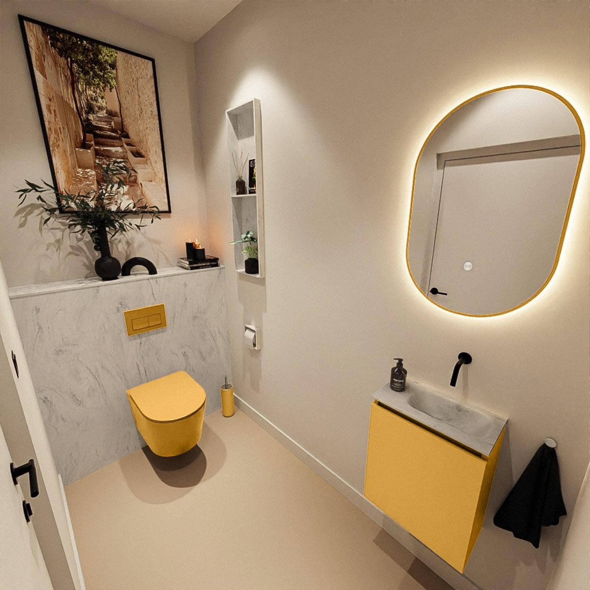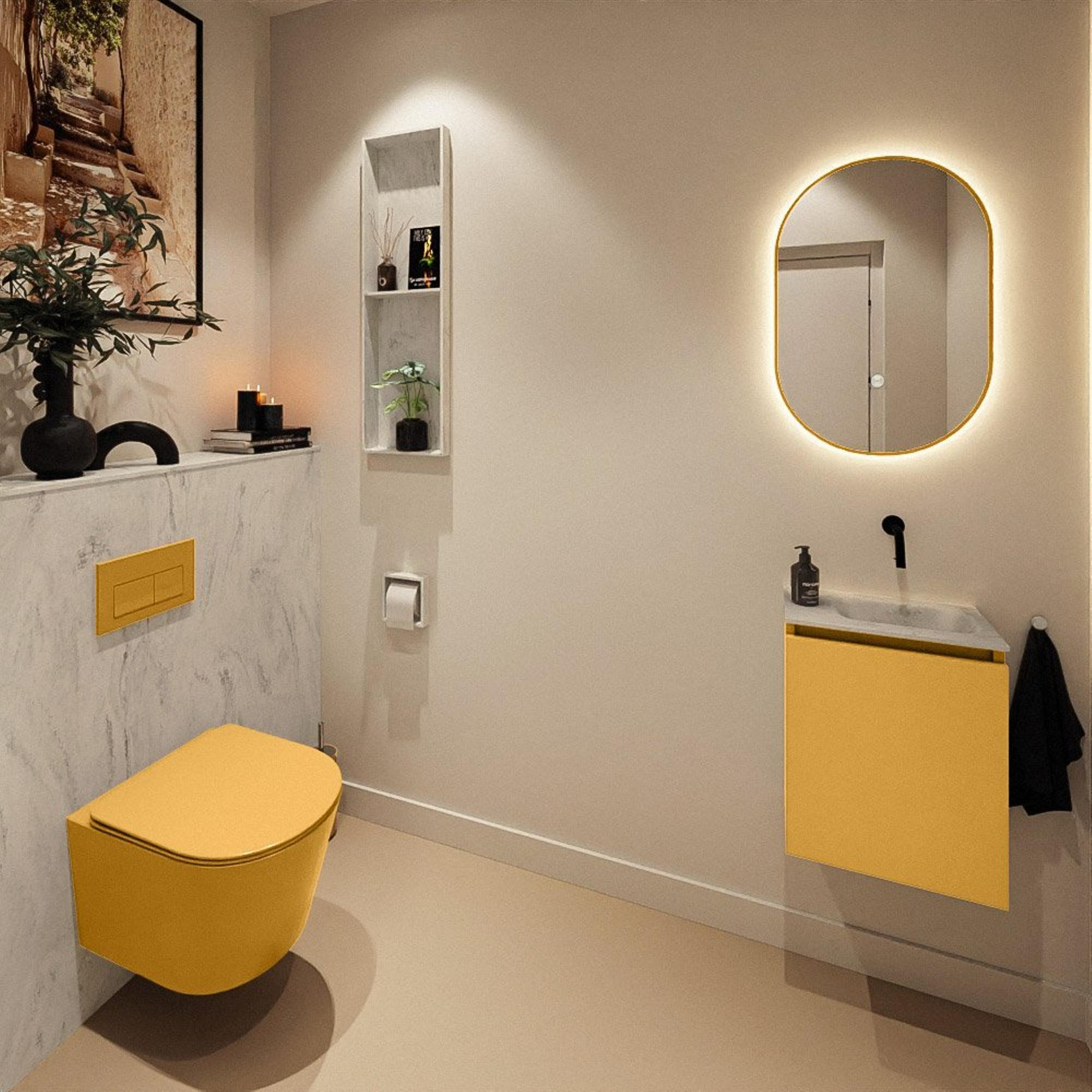 La couleur Ocher chaleureuse du meuble donne immédiatement à vos toilettes une apparence contemporaine et personnelle. Cette teinte jaune orangé se combine joliment avec des matériaux naturels, des accents noirs ou au contraire une robinetterie et une céramique d’un blanc éclatant. Le plan de toilette gris et le lavabo Eden assorti en couleur Opalo offrent un contraste raffiné et une ambiance luxueuse, presque digne d’un hôtel. Grâce au design sans poignée, la façade paraît épurée et sobre, ce qui contribue à une image globale moderne et minimaliste. Vous créez ainsi, avec un meuble relativement petit, tout de même un élément marquant dans votre espace, parfaitement en phase avec les tendances actuelles en matière de salles de bains.