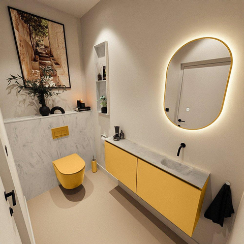 Avec une largeur de 120 cm et une profondeur de seulement 23 cm, ce meuble est conçu pour les espaces où chaque centimètre compte. Les lignes droites, les façades sans poignées et le plateau plat créent une apparence calme et minimaliste qui s’intègre parfaitement dans des toilettes modernes ou design. La combinaison de l’ocre chaud du meuble avec les tons gris et blancs apaisants du plateau et du lavabo donne une ambiance contemporaine et luxueuse, sans que l’ensemble paraisse trop chargé. Grâce à la faible profondeur, vous conservez suffisamment d’espace de passage devant les toilettes, tandis que la largeur généreuse permet au meuble de s’aligner visuellement sur des ensembles de salle de bains plus grands. Vous créez ainsi une sensation d’hôtel, même dans un espace compact.