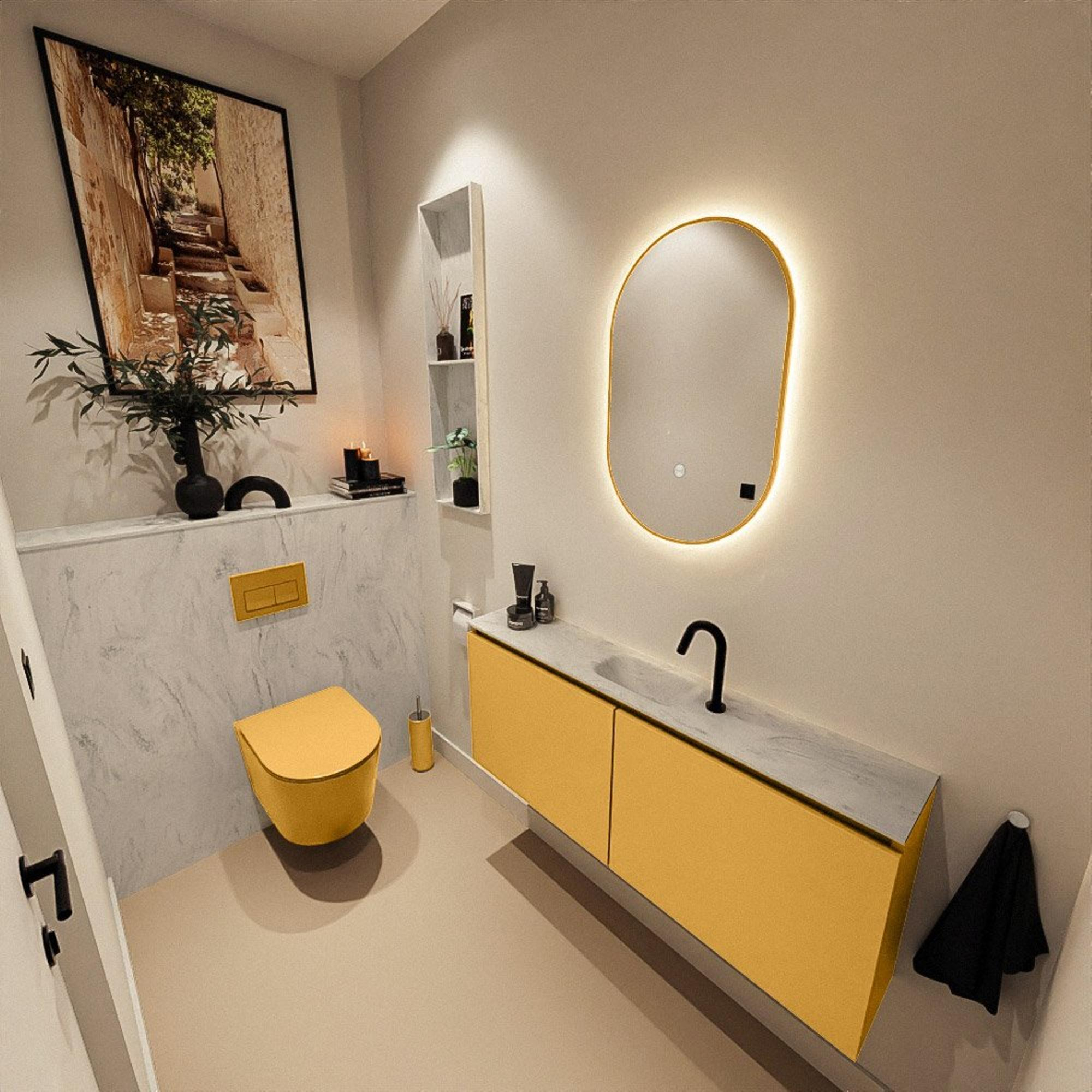 Avec ce meuble de toilette compact et moderne, vous créez une solution élégante et pratique dans vos toilettes ou petite salle de bains. Les lignes épurées, les façades sans poignées et le jaune ocre chaleureux apportent immédiatement de l’ambiance, tandis que la faible profondeur prend à peine de place. Idéal si vous avez un espace de toilettes étroit ou si vous recherchez un meuble discret qui ne domine pas, mais qui se distingue par sa couleur et son design. Le fin plan de vasque en solid surface avec trou de robinet au milieu offre suffisamment d’espace pour vous laver confortablement les mains, tandis que les deux portes derrière la façade offrent un espace de rangement pratique pour votre stock de papier toilette, vos produits d’entretien ou vos serviettes invité. Grâce à son design moderne, ce meuble se combine facilement avec des robinets et accessoires noirs mats, chromés ou colorés, afin que vous puissiez créer aisément votre propre style.