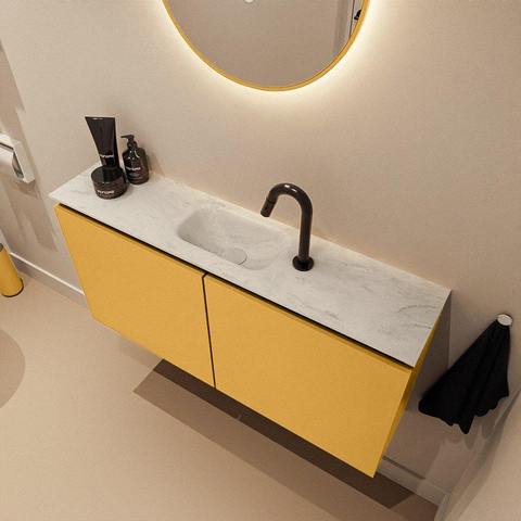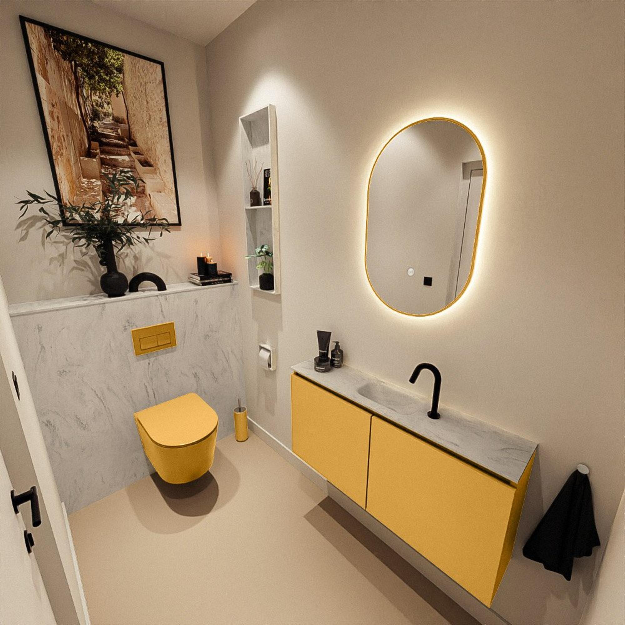 La combinaison d’un meuble de couleur ocre avec une vasque Opalo grise donne immédiatement du caractère à vos toilettes ou à votre salle de bains. L’ocre apporte chaleur et ambiance, tandis que le gris ajoute au contraire calme et douceur. Ensemble, ils forment une base moderne mais intemporelle que vous pouvez facilement associer à des robinets et accessoires noirs, chromés ou en métal brossé. Optez par exemple pour des détails noirs pour un look affirmé et design, ou pour du chrome si vous souhaitez conserver une ambiance claire et fraîche. La façade sans poignée renforce la ligne épurée et permet au meuble de former un seul plan homogène. Il en résulte une apparence luxueuse que l’on ne voit normalement que dans les hôtels design, mais alors pratique à appliquer dans votre propre maison.