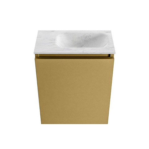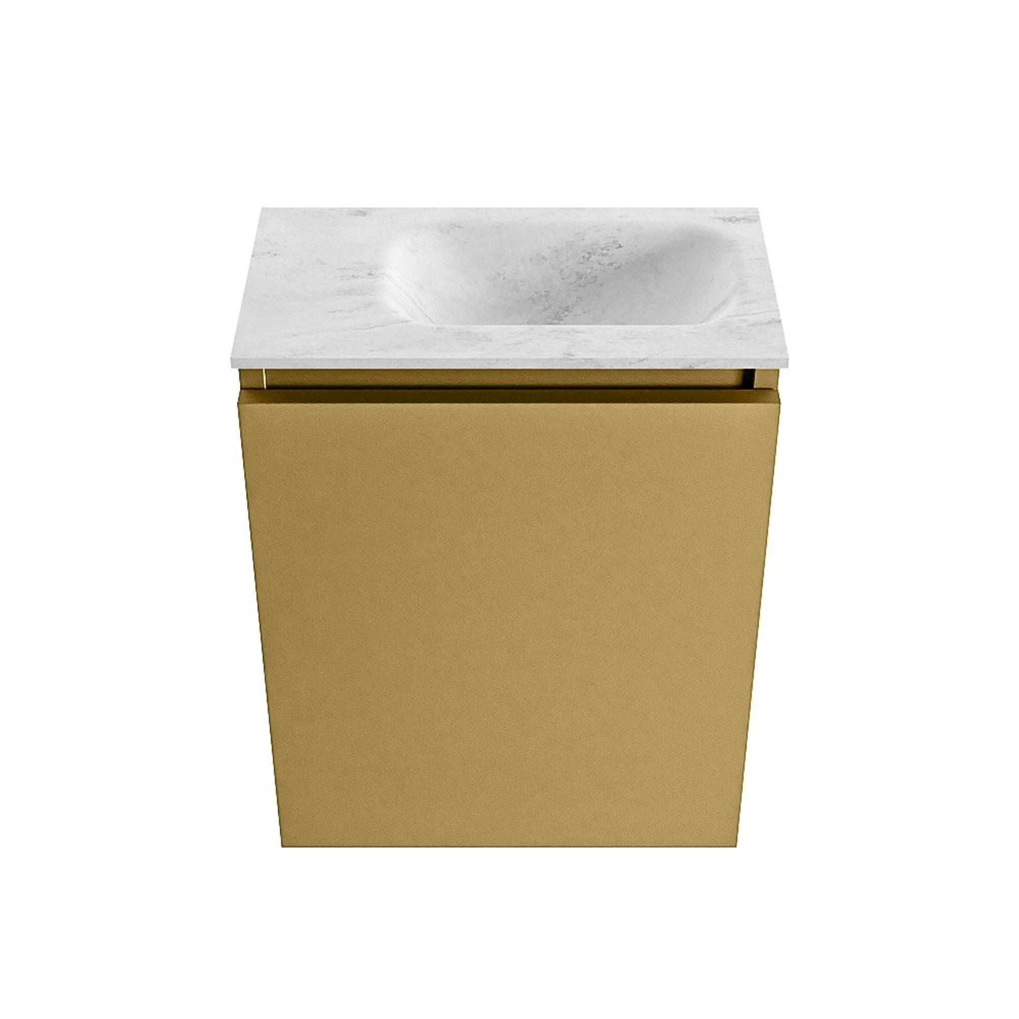 Le meuble doré dans la teinte Oro forme avec le lavabo gris EDEN en couleur Opalo une combinaison remarquable mais néanmoins intemporelle. La façade moderne sans poignées offre un aspect épuré et minimaliste, tandis que la couleur dorée chaleureuse apporte au contraire une atmosphère luxueuse, presque digne d'un hôtel. Le lavabo gris en solid surface s'accorde parfaitement avec les tendances actuelles de la salle de bains, telles que l'effet béton, les robinets noirs et les accents en pierre naturelle. Vous pouvez ainsi facilement combiner ce meuble avec des accessoires noirs, des détails dorés ou des carreaux neutres. Que vous souhaitiez rénover des toilettes existantes ou créer un look entièrement nouveau, cette combinaison de couleurs donne immédiatement du caractère à votre intérieur.