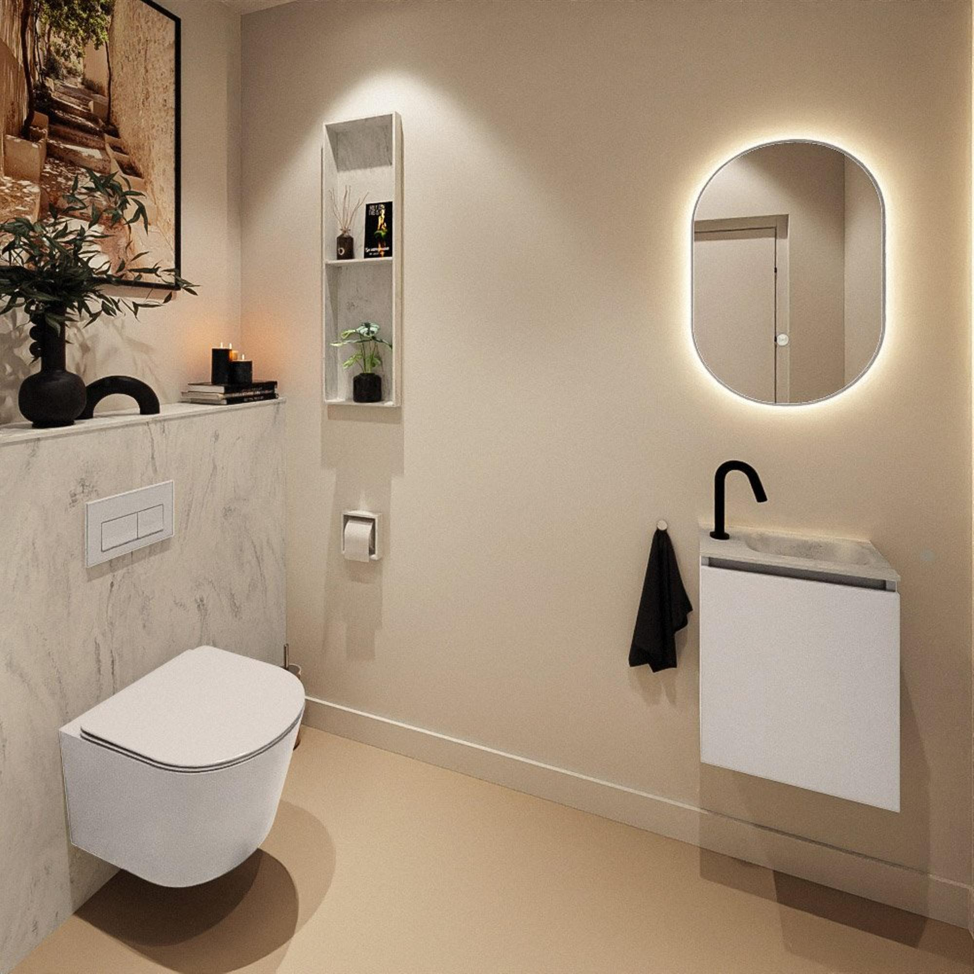 Avec ce meuble toilettes compact, vous créez même dans un petit espace de toilettes ou une salle de bains étroite un point d'eau complet et élégant. La combinaison du caisson fin et du lavabo moderne le rend idéal pour des toilettes, une niche ou tout autre endroit où l'espace est limité mais où vous souhaitez tout de même du confort et du style. Grâce à sa faible profondeur, le meuble dépasse à peine, ce qui vous permet de conserver votre espace de circulation et de garder la pièce visuellement calme. La couleur chaleureuse Linen s'harmonise parfaitement avec les intérieurs modernes, scandinaves ou naturels, tandis que les lignes épurées et la finition sans poignées s'intègrent parfaitement dans un style minimaliste. Vous recherchez une solution pratique avec suffisamment d'espace de rangement pour, par exemple, des rouleaux de papier toilette de réserve, du savon et des produits d'entretien, tout en conservant un ensemble léger et élégant ? Alors cet ensemble est un choix particulièrement malin.