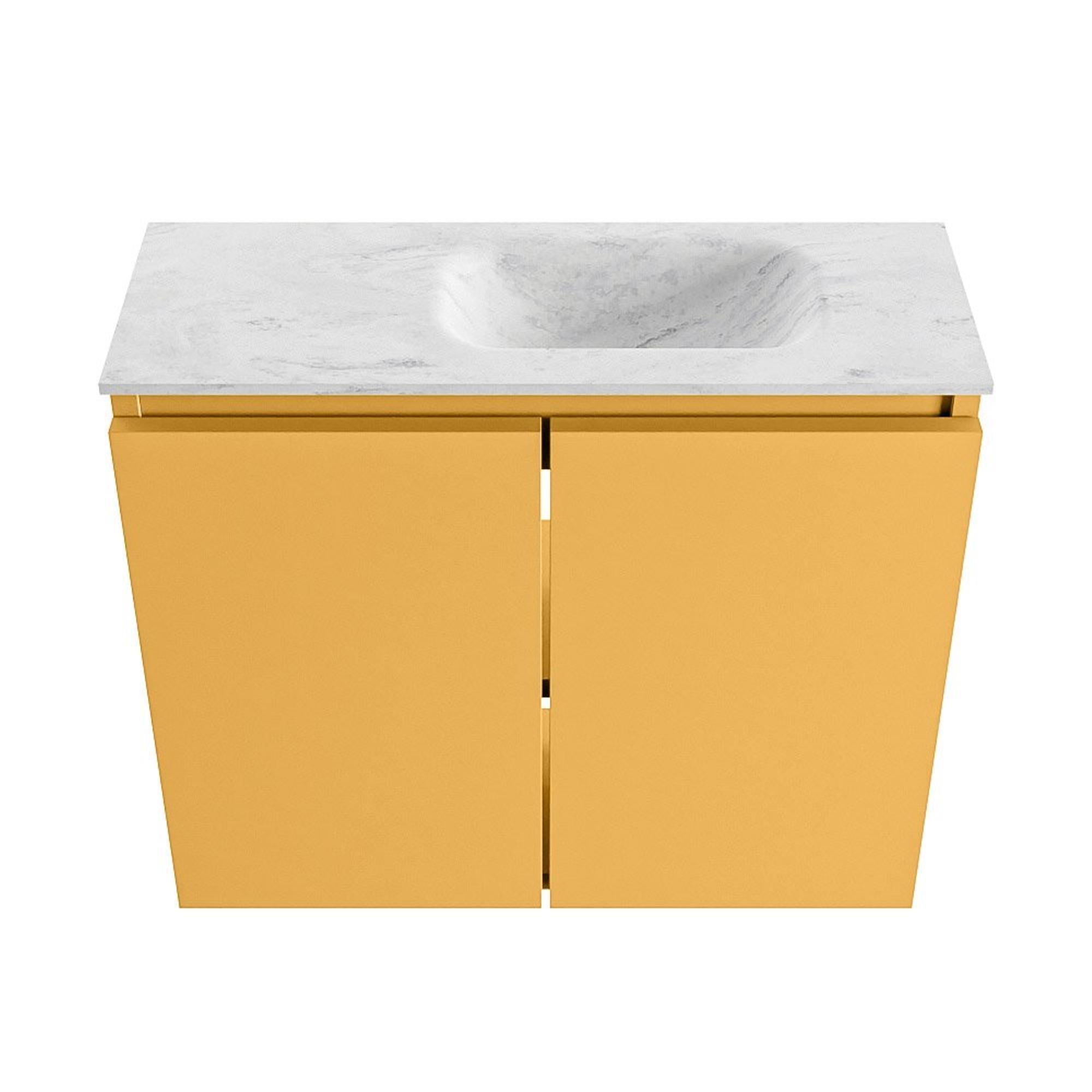 Le meuble ocre combiné au lavabo en solid surface gris offre un aspect contemporain et luxueux. Ocher apporte chaleur et caractère à vos toilettes ou à votre salle de bains, tandis que le lavabo gris apporte calme et raffinement. Cette combinaison se marie facilement avec des robinets et accessoires noirs, chromés ou en métal brossé, vous permettant de créer aisément un ensemble harmonieux. La finition sans poignées renforce le look épuré et moderne et rend le meuble particulièrement discret visuellement – idéal si vous visez un style minimaliste et haut de gamme dans un petit espace.