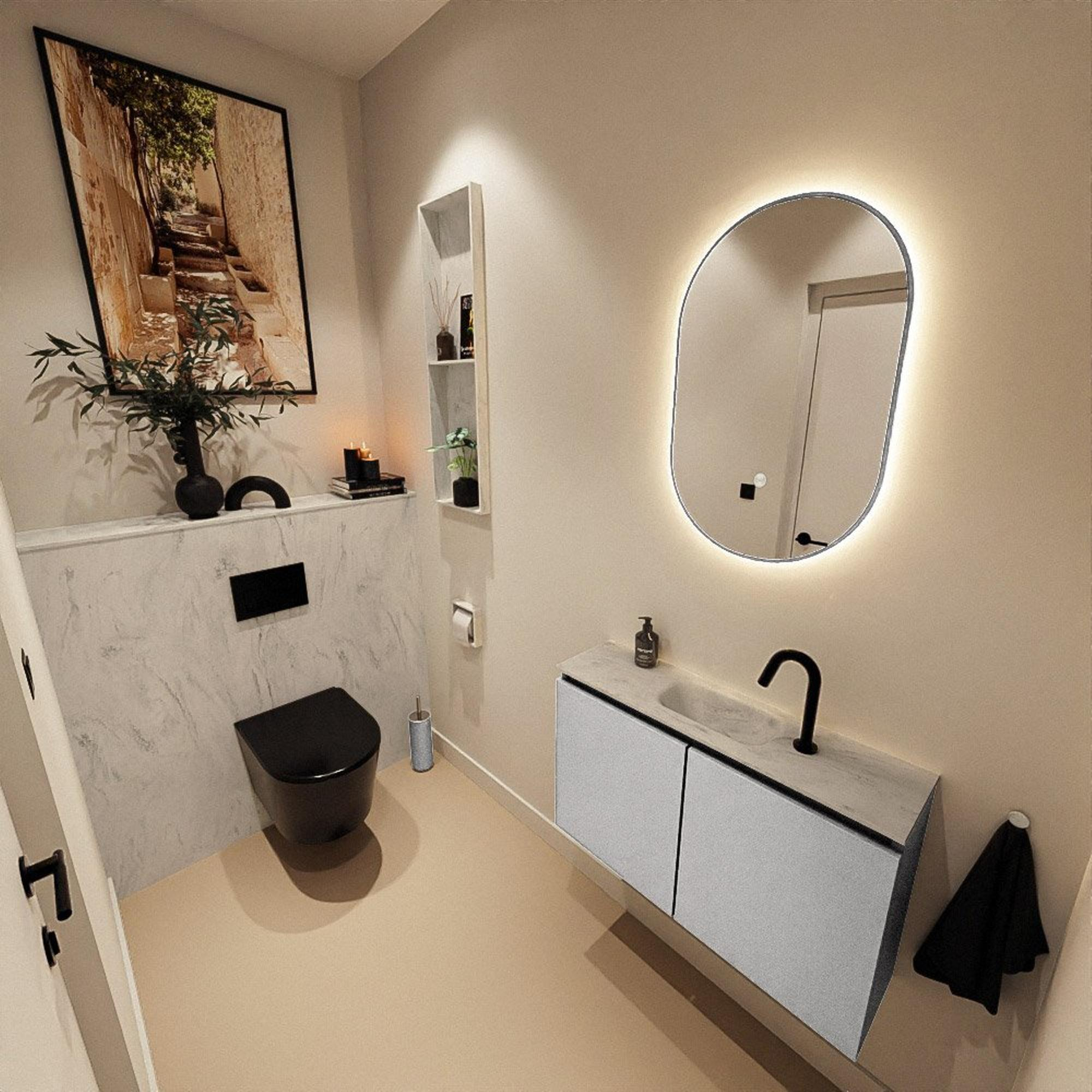 La couleur grise Plata du meuble, combinée au lavabo Opalo, crée un aspect contemporain et raffiné. Opalo est connu pour son aspect clair et pierreux, qui ajoute une atmosphère subtile et luxueuse sans que l’ensemble ne devienne trop voyant. Ces teintes neutres se marient facilement avec des carreaux muraux blancs, un effet béton, des accents noirs ou, par exemple, un sol en bois. Vous pouvez ainsi finir vos toilettes ou votre petite salle de bains dans le même style que le reste de votre maison. Grâce à la façade sans poignée, le meuble affiche un aspect épuré et minimaliste, qui s’accorde parfaitement avec les tendances sanitaires modernes.