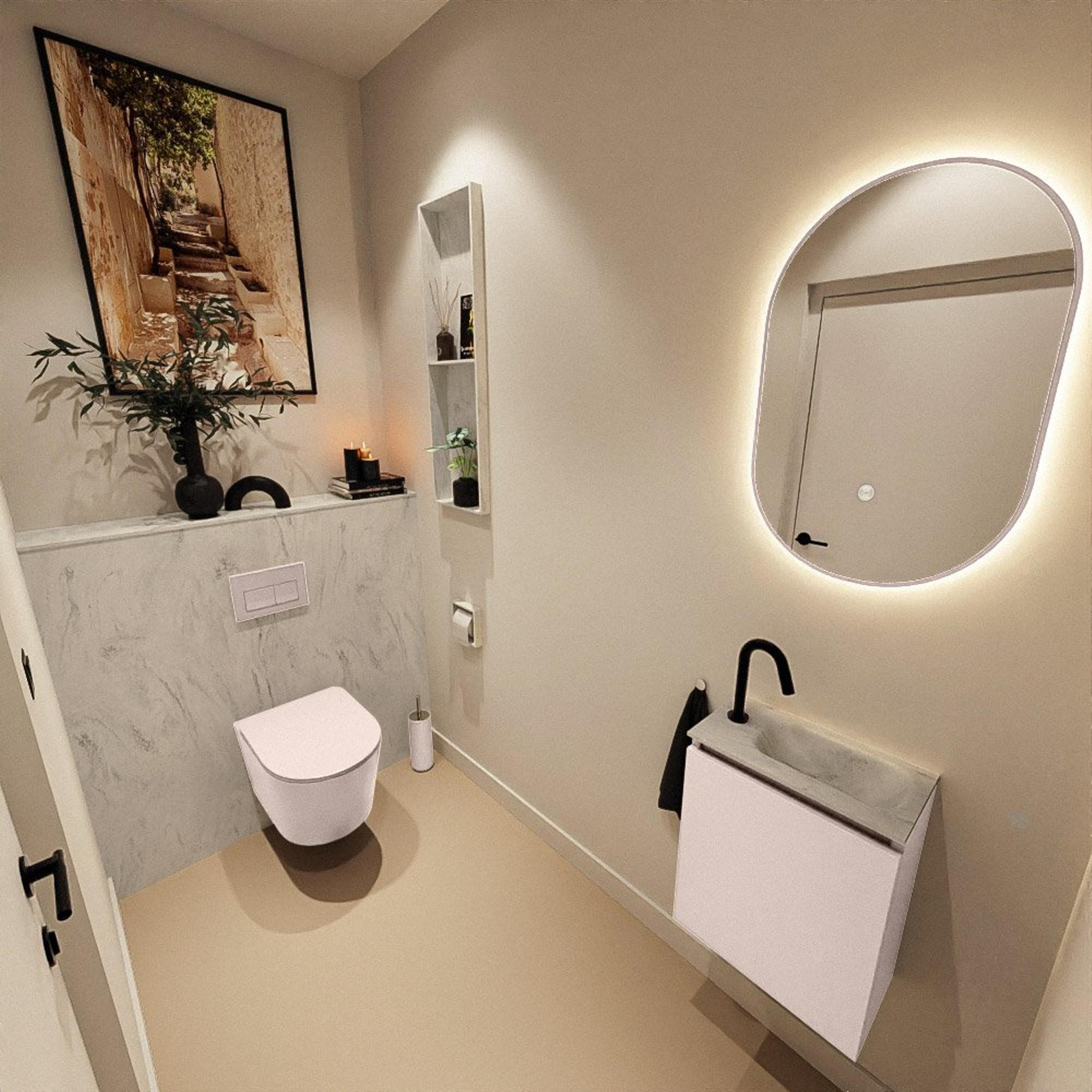 La couleur rose douce du meuble (Rosee) forme un contraste chaleureux avec la vasque Opalo grisâtre en solid surface. Cette combinaison donne à vos toilettes ou à votre salle de bains une apparence moderne et en même temps chaleureuse. La finition sans poignée souligne le design minimaliste et permet au meuble de s’intégrer parfaitement dans un intérieur épuré, scandinave ou de style hôtel chic. En choisissant la couleur pour votre meuble, vous faites de l’espace toilettes bien plus qu’un simple lieu fonctionnel : il devient un élément réfléchi de votre intérieur. Combinez par exemple ce meuble avec des robinets et accessoires noirs, laiton ou chromés afin de prolonger le style entièrement selon vos goûts.