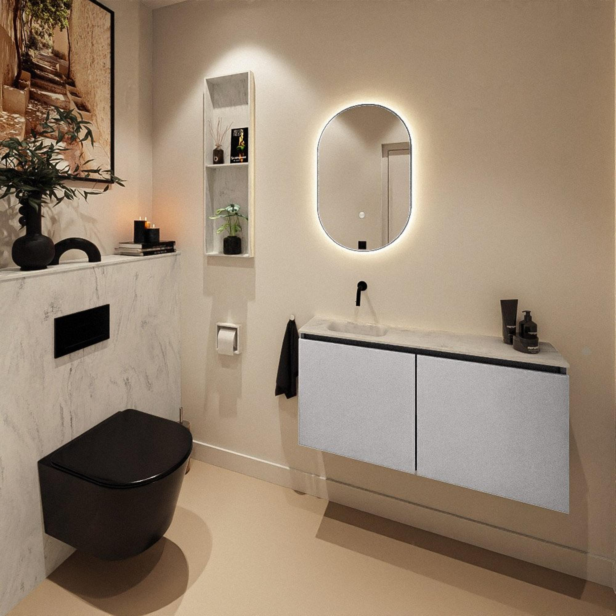 Avec une profondeur de seulement 23 cm, ce meuble est spécialement conçu pour les petits WC et les salles de bains étroites. Vous pouvez vous laver les mains confortablement sans que le meuble empiète trop dans la pièce, ce qui permet de préserver l’espace de circulation. La largeur généreuse de 100 cm crée malgré tout une ligne horizontale luxueuse le long du mur, ce qui donne une impression de volume plus important. En positionnant la vasque à gauche, on obtient sur le côté droit une zone de dépose pratique pour le savon, les diffuseurs de parfum ou une petite serviette. Vous combinez ainsi une facilité d’utilisation optimale avec un jeu de lignes épuré qui s’intègre parfaitement dans des toilettes modernes.