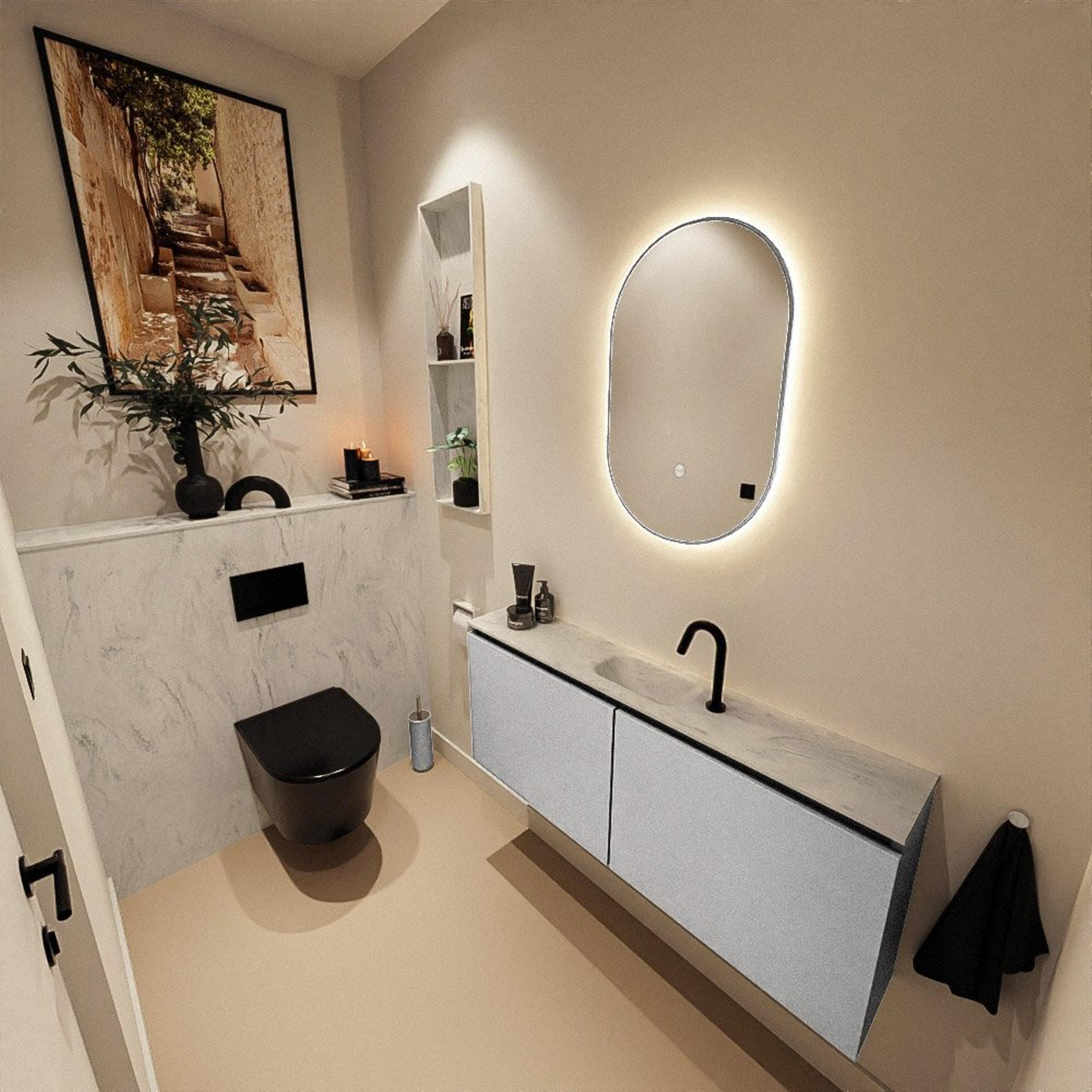 Avec une largeur de 120 cm et une profondeur de seulement 23 cm, ce meuble WC offre une belle apparence généreuse le long du mur, sans empiéter sur l’espace de circulation. La faible profondeur est parfaite pour des toilettes ou une petite salle de bains où chaque centimètre compte. La position du lavabo au milieu assure une disposition logique et rend le meuble agréable à utiliser, même lorsque plusieurs personnes utilisent les toilettes à la suite. Grâce au trou de robinet unique, vous pouvez facilement installer un petit robinet de lavabo qui est bien proportionné par rapport au plan. Vous combinez ainsi un lavage des mains confortable avec une apparence fine et raffinée.