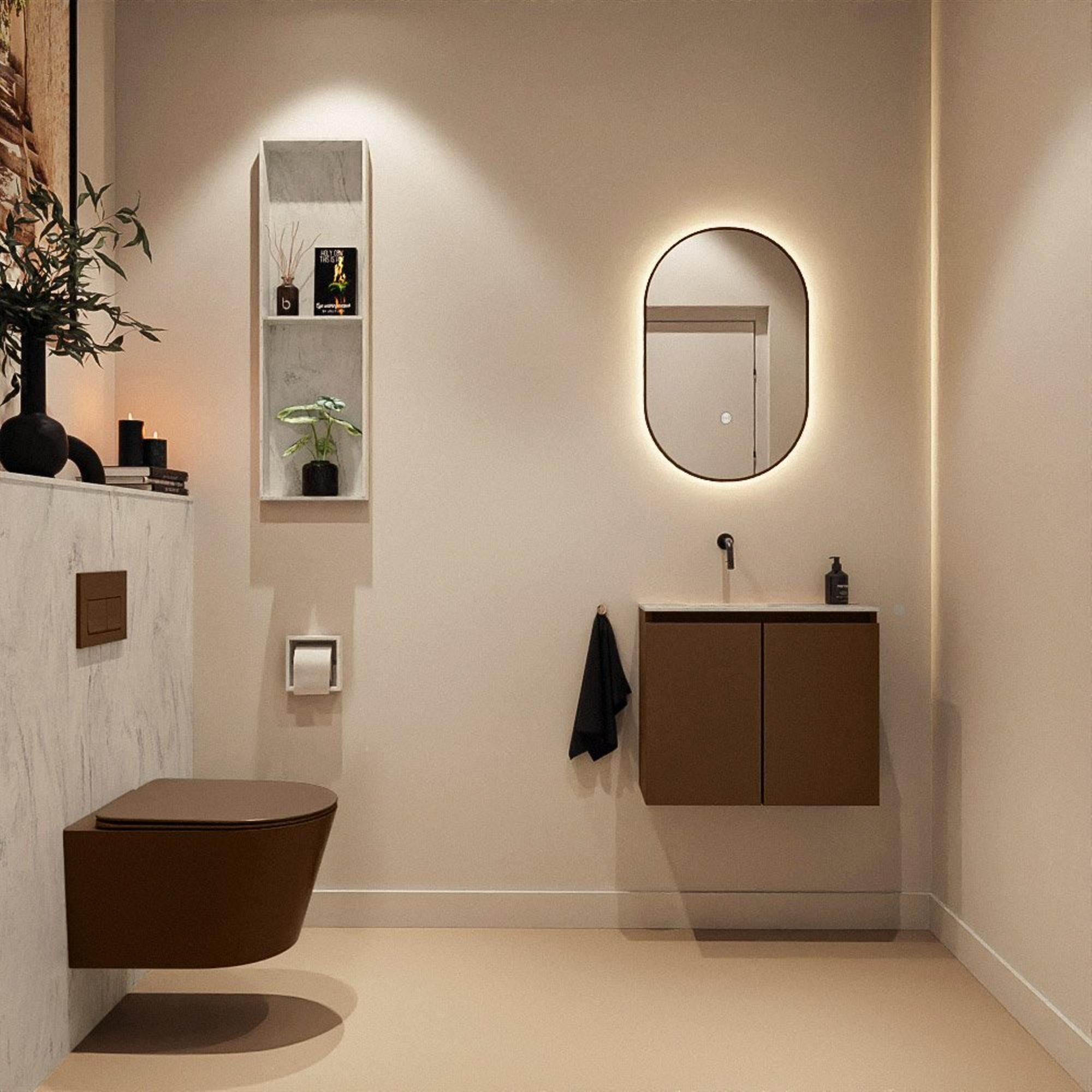 La combinaison de l’aspect bois couleur rouille avec le plan vasque en Solid Surface gris aux lignes nettes donne immédiatement à vos toilettes une apparence moderne et haut de gamme. Le meuble s’harmonise parfaitement avec les salles de bains contemporaines de style naturel ou industriel, mais se marie aussi très bien avec des robinets noirs, des accessoires blanc mat ou au contraire un chrome classique. La couleur Rust présente une teinte bois brun chaude qui apporte beaucoup d’ambiance, sans être dominante dans un petit espace. Le lavabo Opalo, avec ses lignes épurées et son design minimaliste, apporte équilibre et sérénité à l’ensemble. Comme le lavabo ne possède pas de trou de robinet, vous choisissez vous-même un robinet mural ou encastré assorti, ce qui vous permet d’accorder totalement le style au reste de votre sanitaire.