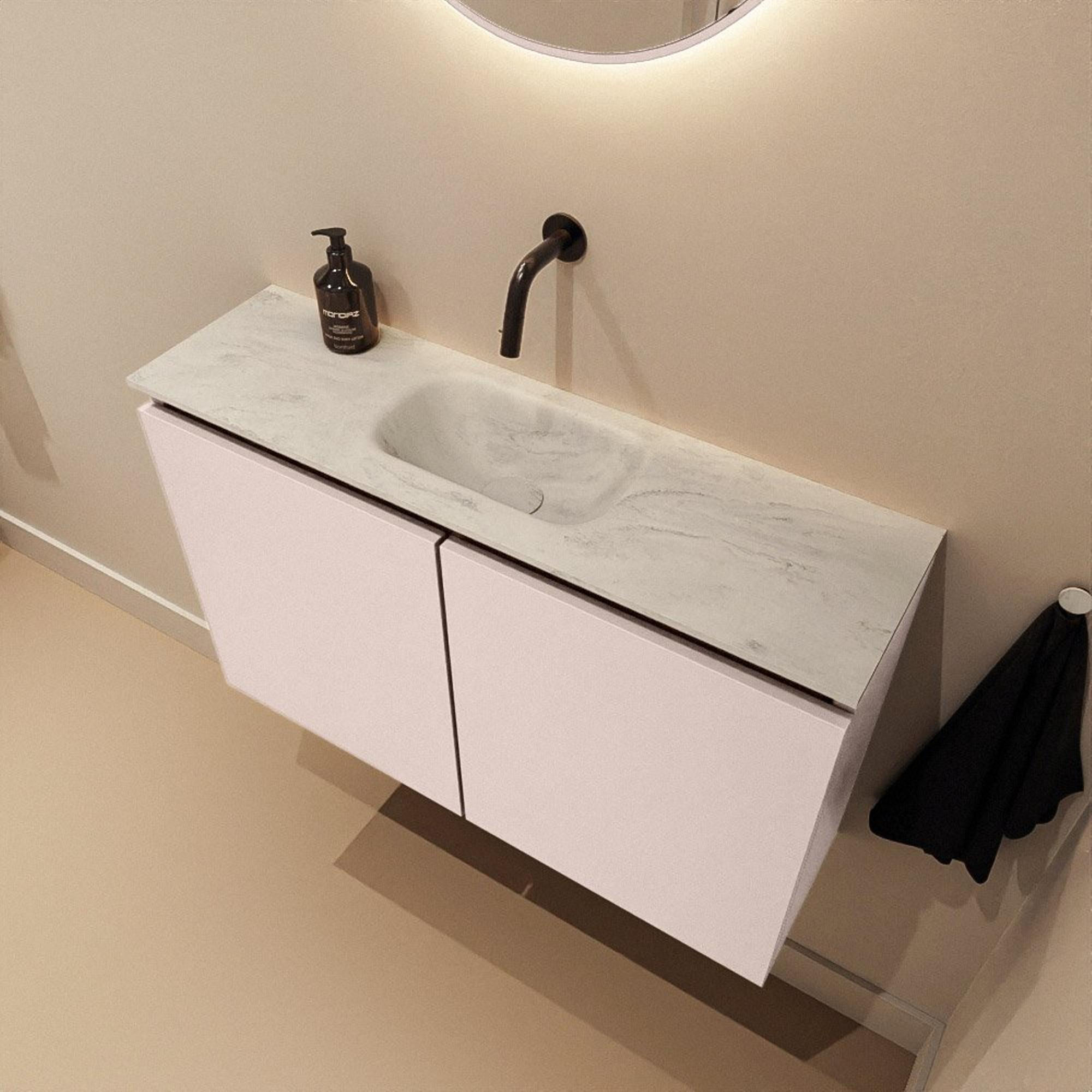 Le plan de lavabo est réalisé en solid surface dans la couleur Opalo, un matériau de haute qualité au rendu net et au toucher agréable. Le solid surface est connu pour sa finition soignée, sa stabilité de couleur et sa facilité d’entretien, ce qui vous garantit une qualité fiable pendant de nombreuses années. La vasque est placée au centre et aucun trou de robinet n’est pré-percé ; vous pouvez ainsi choisir vous-même un mitigeur sur gorge élégant monté sur le plan ou un robinet mural au-dessus du lavabo. Cela vous offre une liberté maximale dans l’aménagement et permet d’accorder facilement le style de votre robinet au reste de la salle de bains. Les surfaces lisses se nettoient rapidement, de sorte que vos toilettes paraissent toujours fraîches et soignées.