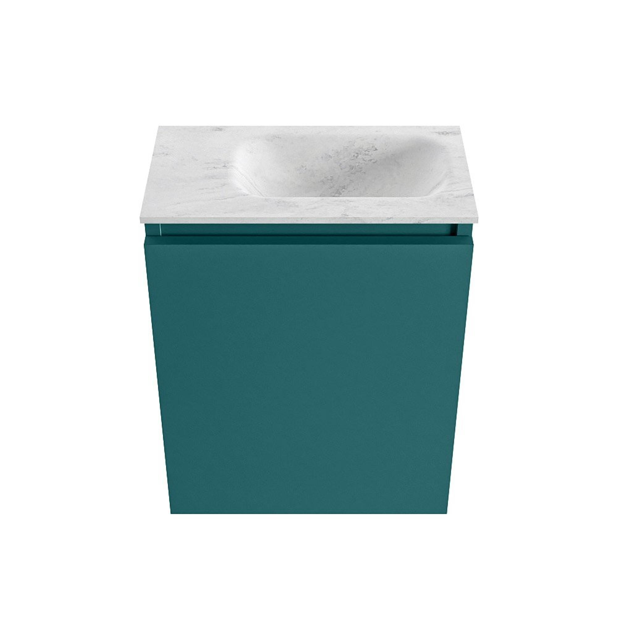 Le caisson est réalisé dans la couleur Smag, une teinte moderne de la gamme des verts, souvent décrite comme une nuance bleu-vert contemporaine. En combinaison avec le plan en solid surface gris et le lavabo Opalo (une couleur claire et fraîche), on obtient un aspect luxueux et axé sur le design, qui s’intègre parfaitement dans une salle de bains ou des toilettes modernes. Les lignes droites, les façades sans poignées et la palette de couleurs apaisante offrent un look minimaliste qui se marie facilement avec des robinets noirs, chromés ou en métal brossé. Vous pouvez ainsi harmoniser vos toilettes avec le style du reste de votre salle de bains en toute simplicité.