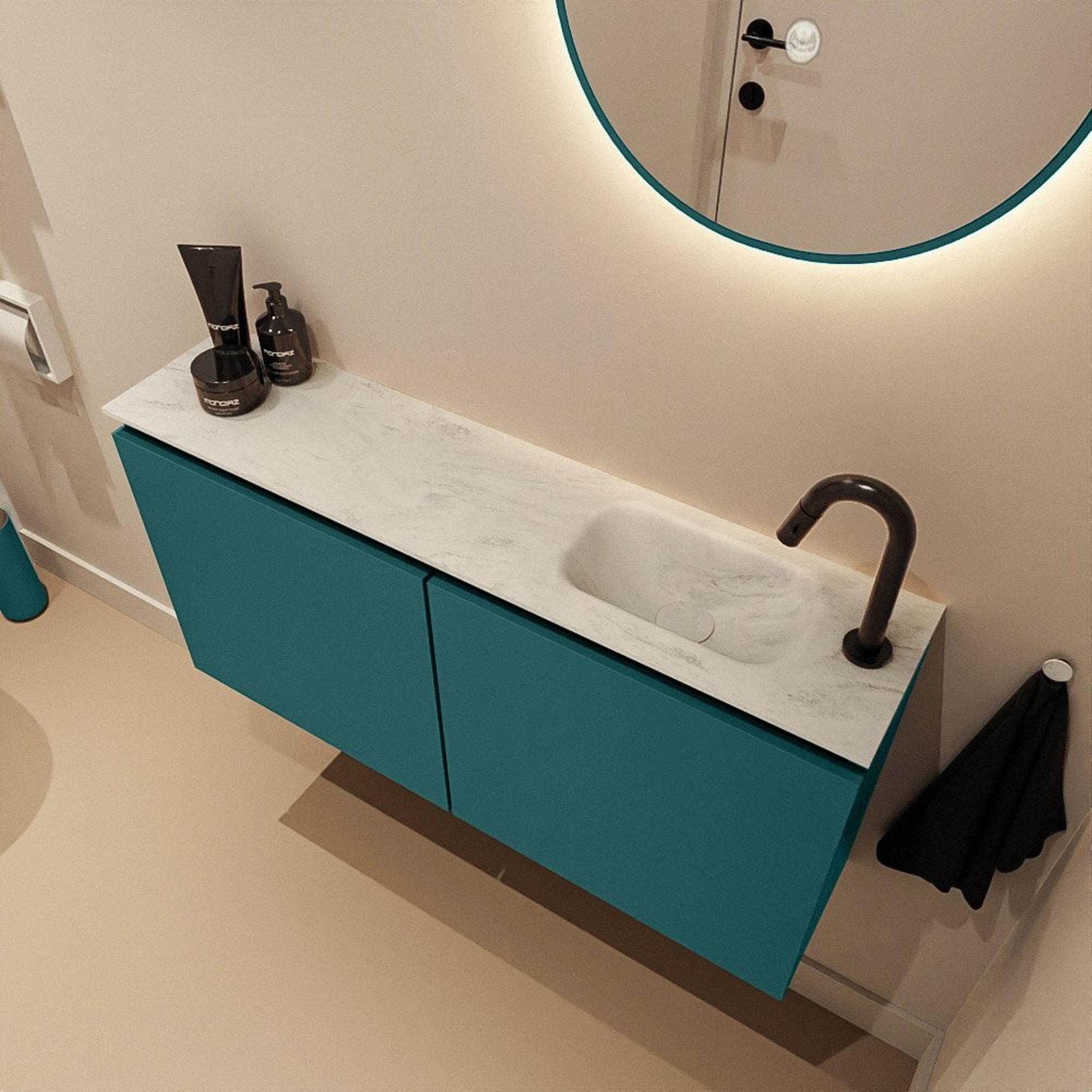 Ce meuble WC élégant est idéal si vous souhaitez aménager intelligemment un espace WC étroit et moderne ou une petite salle de bains compacte, sans rien sacrifier à l’esthétique. La combinaison d’un meuble peu profond et d’un long plan de vasque épuré offre suffisamment d’espace de dépose pour le savon et les accessoires, tout en permettant de se laver confortablement les mains. Grâce à la subtile teinte verte du meuble bas associée à la vasque au calme aspect marbre, l’ensemble est intemporel et s’intègre parfaitement dans des intérieurs scandinaves, modernes ou de style hôtel chic. Si vous recherchez une solution pratique avec un seul point d’eau, un trou de robinet à droite et une allure raffinée qui donne une impression d’espace même dans les petites pièces, ce meuble répond parfaitement à vos attentes.