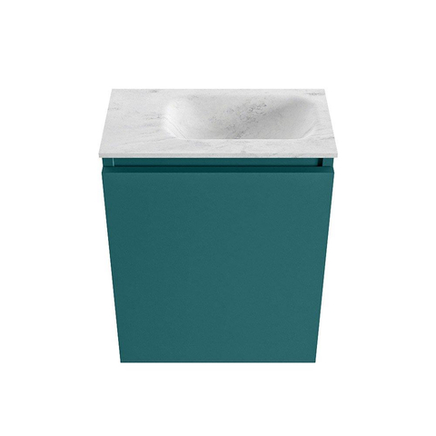 Le meuble de couleur Smag, une teinte verte moderne, donne immédiatement du caractère à vos toilettes ou à votre petite salle de bains. En combinaison avec le plan de lavabo gris Opalo en solid surface, il forme un ensemble chic et contemporain qui s'intègre parfaitement aux tendances actuelles en matière de sanitaire. Les façades droites sans poignées renforcent le design minimaliste tout en apportant une atmosphère calme dans un petit espace. Cette combinaison se marie très bien avec des robinets et accessoires noirs, chromés ou en métal brossé, afin que vous puissiez facilement prolonger votre propre style dans le reste de la pièce. Vous transformez ainsi un coin fonctionnel en véritable accroche-regard.