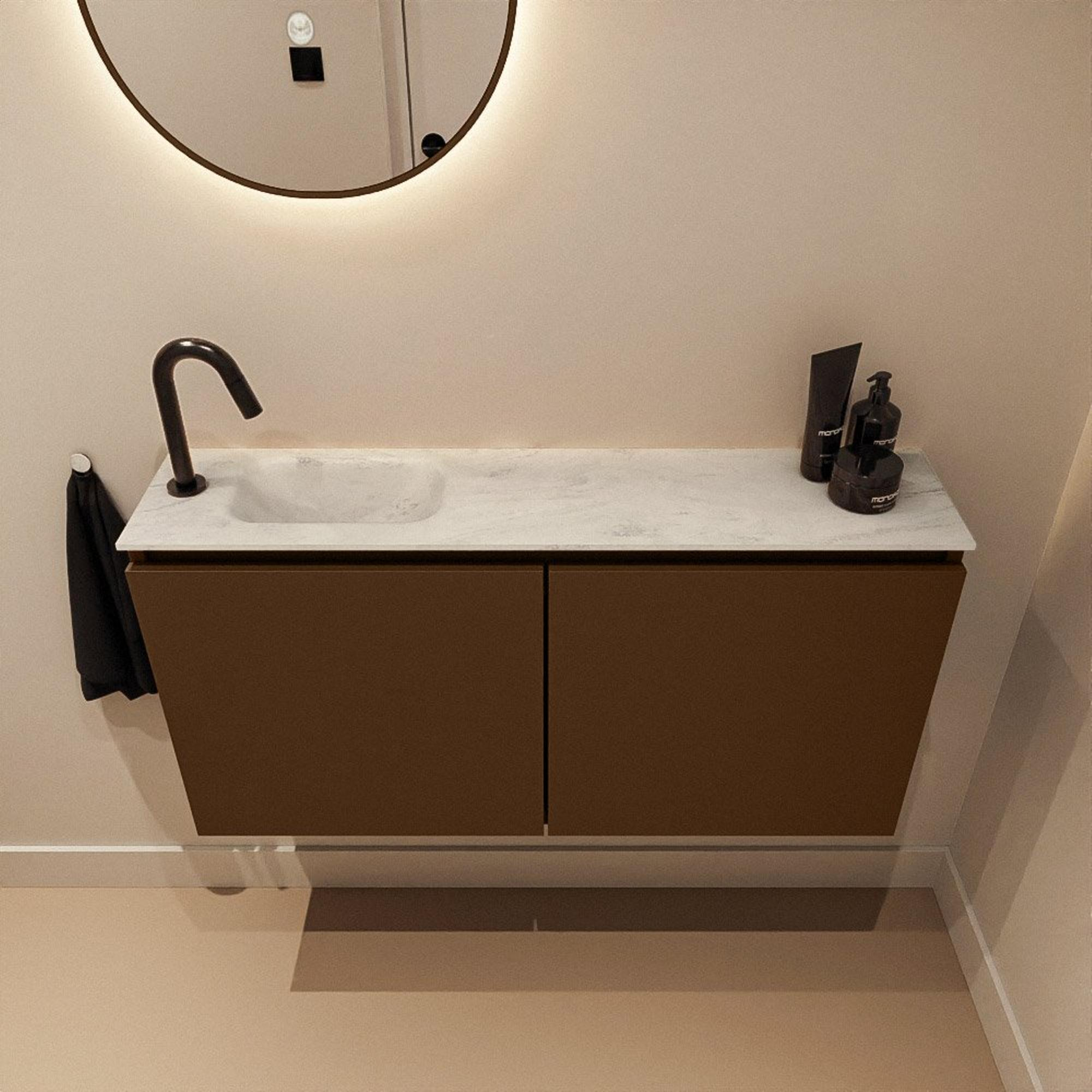 MONDIAZ TURE-DLUX Meuble de toilettes 100 cm Rust. EDEN lavabo Opalo position gauche. Avec 1 trou de robinet.