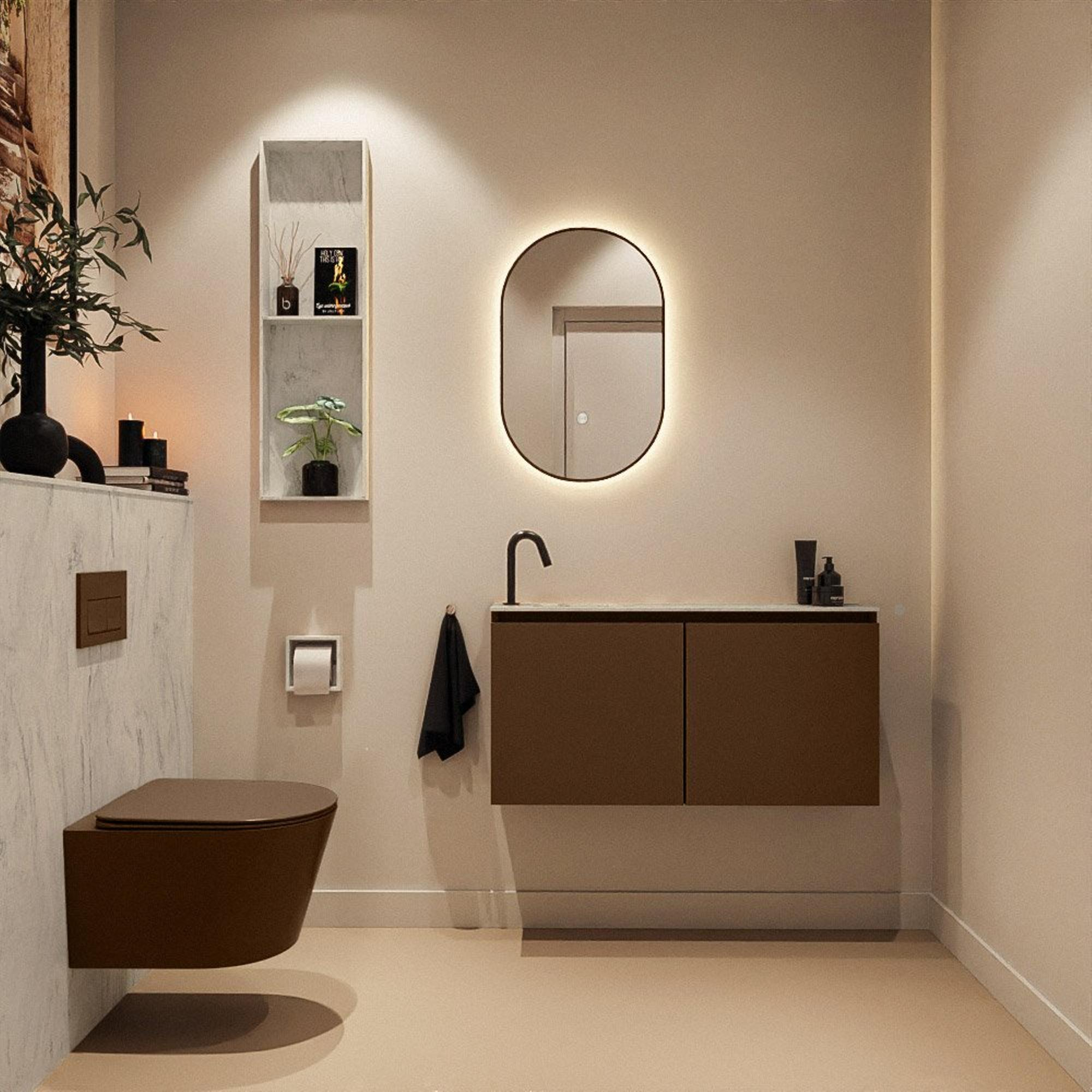 La couleur Rust confère au meuble une apparence chaleureuse et naturelle avec une touche moderne. Le meuble en MDF forme un beau contraste avec le plan de lavabo épuré en Solid Surface de couleur grise, qui dégage une allure luxueuse et se combine parfaitement, par exemple, avec des robinets et accessoires noirs mats, en métal brossé ou de couleur chromée. Le lavabo Eden intégré dans l’interprétation Opalo présente des lignes nettes et un design sobre, ce qui vous permet de créer un look digne d’un hôtel dans vos toilettes ou votre petite salle de bains. Cette combinaison de teinte bois et de plan de lavabo épuré s’intègre parfaitement dans un aménagement moderne, industriel ou scandinave et se marie facilement avec des carreaux effet béton ou pierre naturelle.
