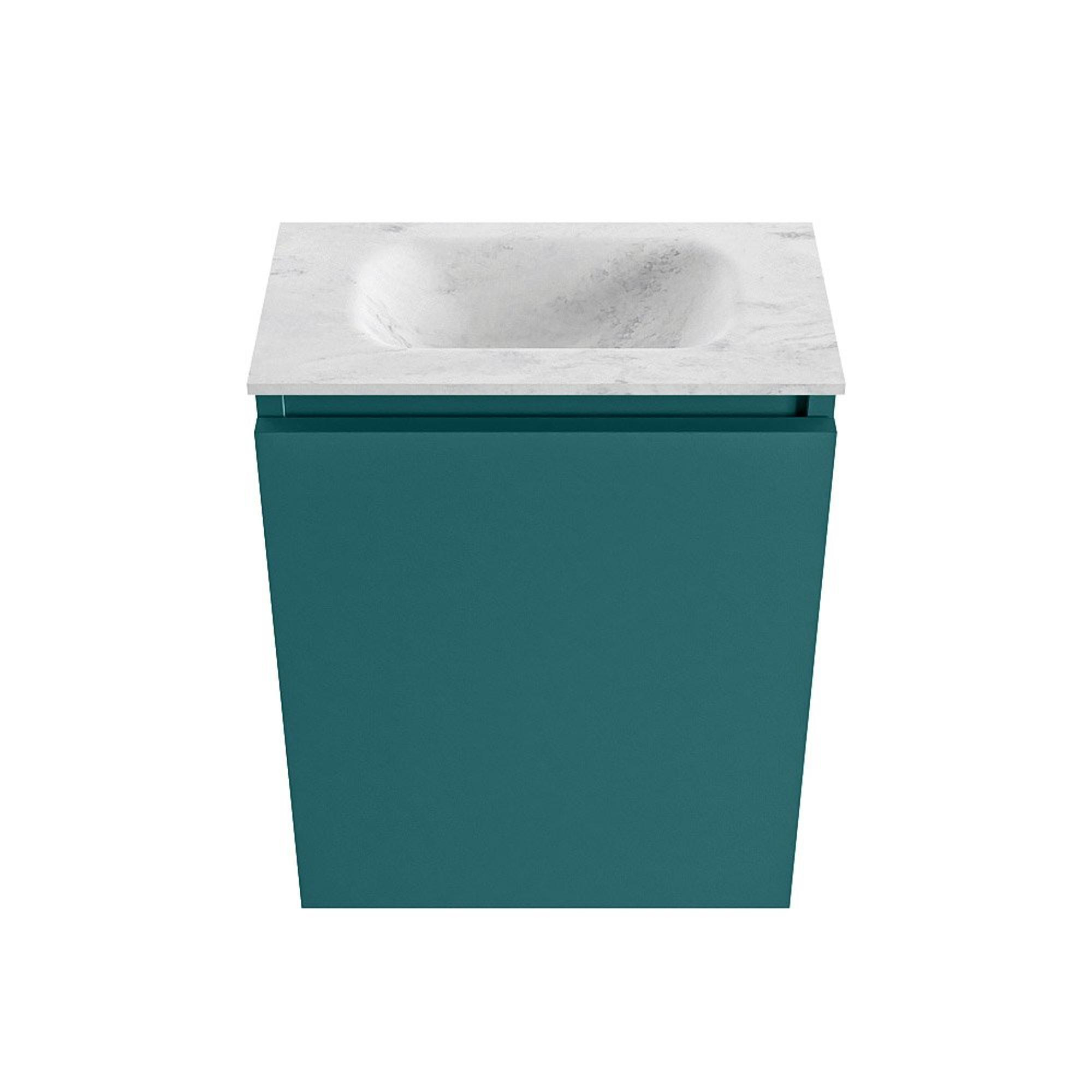 Le meuble est réalisé dans la couleur moderne Smag, un vert profond à l'aspect luxueux et contemporain qui se marie à merveille avec des carreaux clairs et des tons bois naturels. La vasque Eden assortie en solid surface dans la couleur Opalo apporte un contraste raffiné : épurée, mate et chic. Cette combinaison crée un ensemble calme et harmonieux qui donne immédiatement du caractère à vos toilettes ou à votre salle de bains. Grâce à la façade sans poignée, les lignes restent minimalistes, ce qui permet à ce meuble de s'intégrer parfaitement dans un intérieur moderne ou design et de se combiner facilement avec des robinets et accessoires noirs, chromés ou en métal brossé.