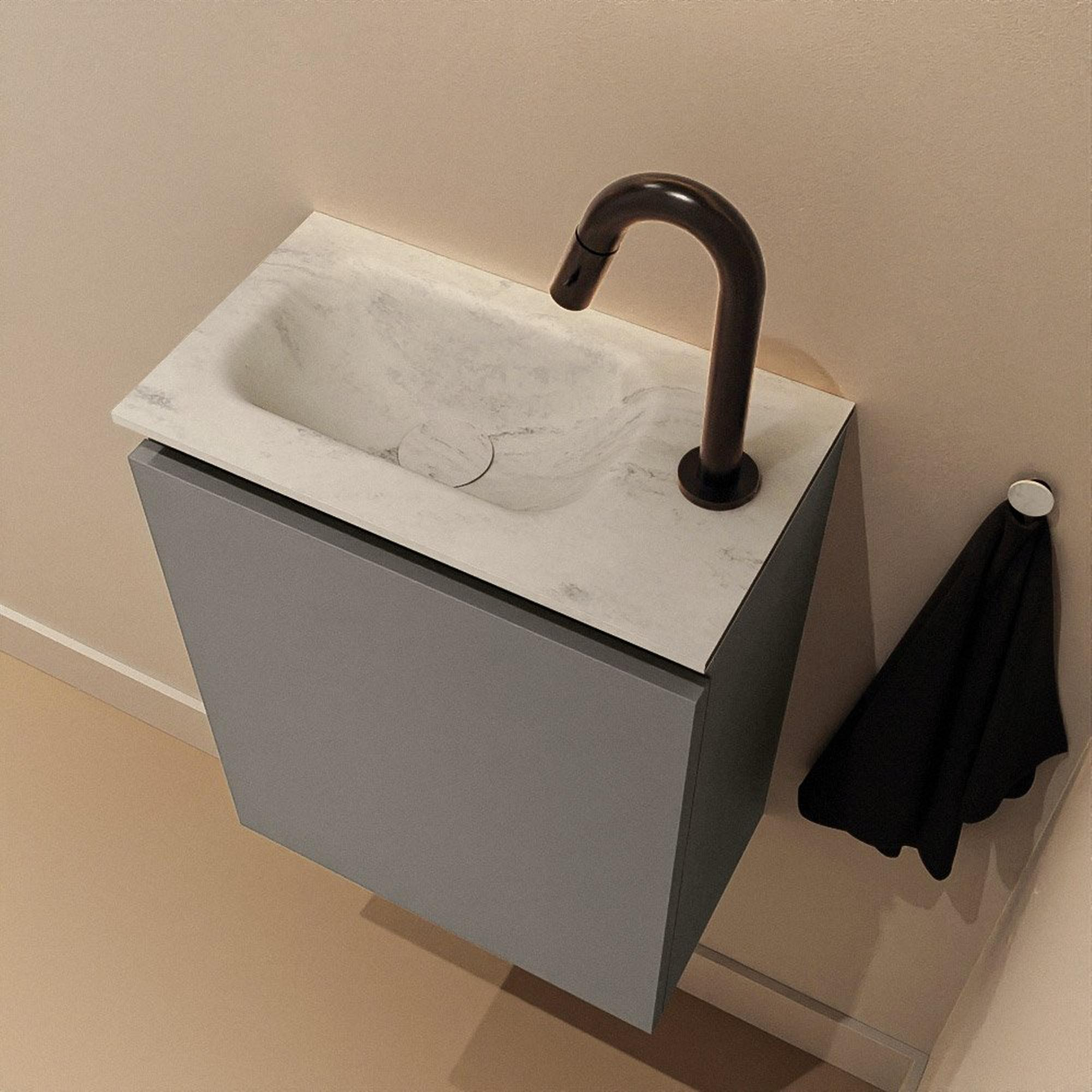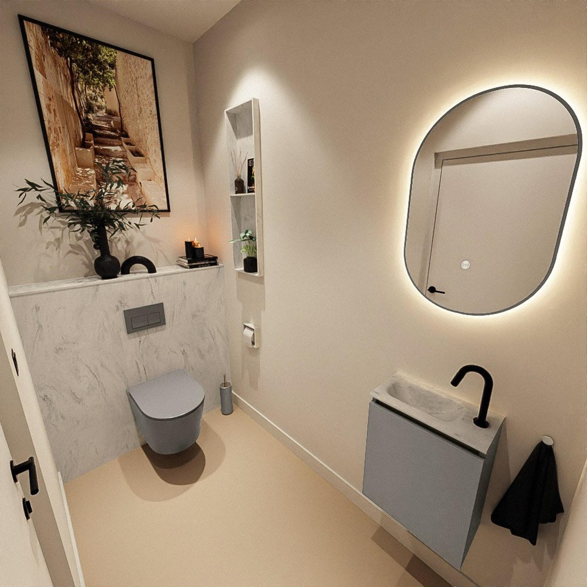 La couleur Smoke du meuble, une teinte anthracite moderne, donne immédiatement à tes toilettes un aspect luxueux et contemporain. En combinaison avec le lavabo gris EDEN Opalo, il se crée un contraste subtil qui s’accorde parfaitement avec les robinets noirs, les accessoires en inox ou les carreaux clairs. La façade sans poignée assure une apparence épurée et minimaliste sans interruptions, idéale si tu aimes un style calme et moderne. Comme le meuble est en MDF et le plan en solid surface, l’ensemble donne une impression solide et qualitative. Tu ne fais donc pas seulement entrer quelque chose de beau chez toi, mais aussi quelque chose qui s’intègre dans un aménagement de salle de bains durable et moderne.