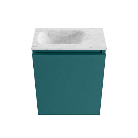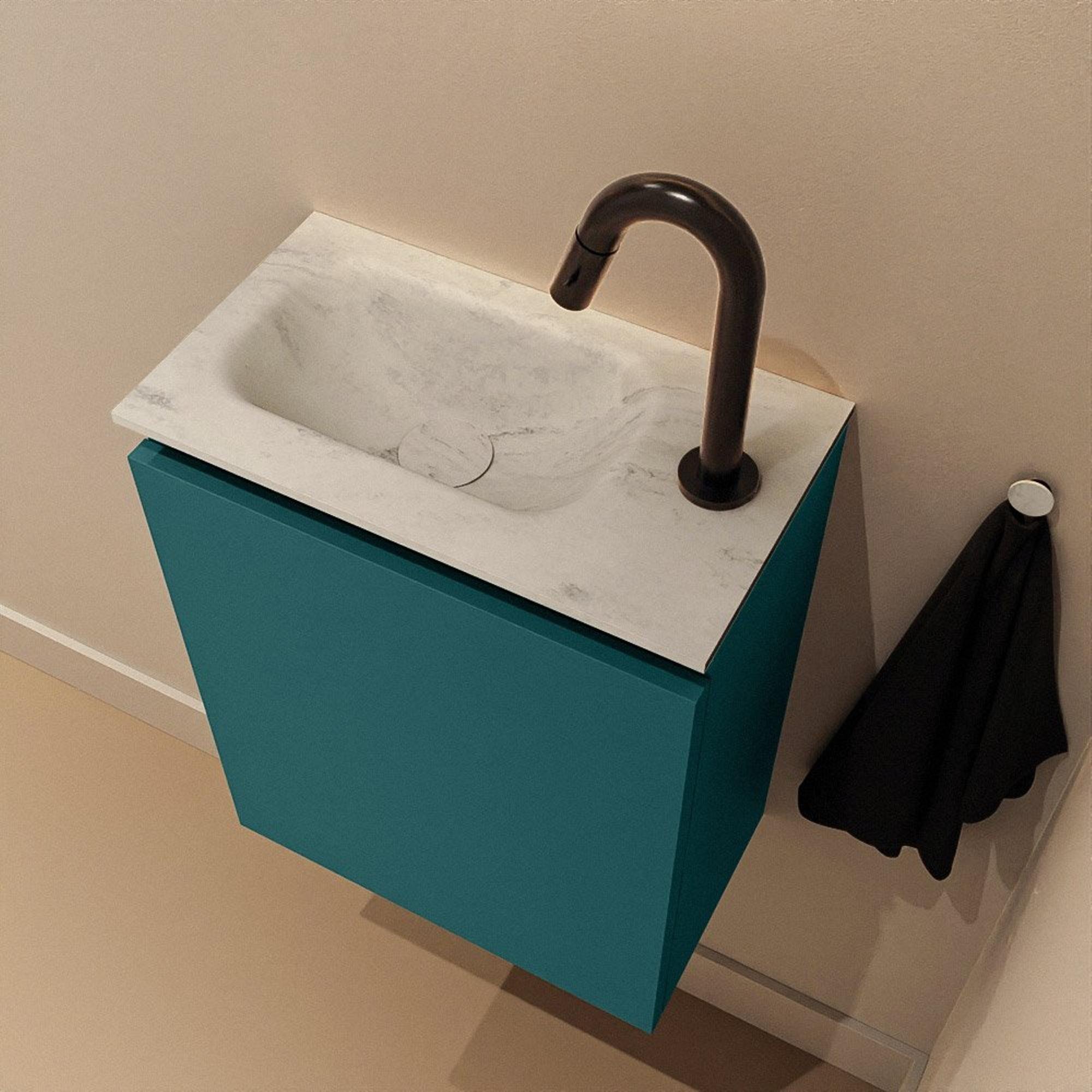 Avec une largeur de 40 cm et une profondeur de seulement 23 cm, ce meuble est parfait pour les petites salles de bains et toilettes où vous souhaitez utiliser l’espace de manière efficace. La faible profondeur évite que le meuble ne dépasse trop dans la pièce, de sorte que vous conservez l’espace de circulation et que la pièce reste visuellement calme. Grâce à la hauteur de 50 cm, vous disposez malgré tout de suffisamment d’espace de rangement derrière la porte, idéal pour le savon pour les mains, les rouleaux de papier toilette ou les produits d’entretien que vous souhaitez garder hors de vue. Avec le trou de robinet à gauche et le lavabo également placé à gauche, ce meuble convient très bien aux niches étroites ou aux murs où vous avez besoin de plus de liberté de mouvement d’un seul côté.