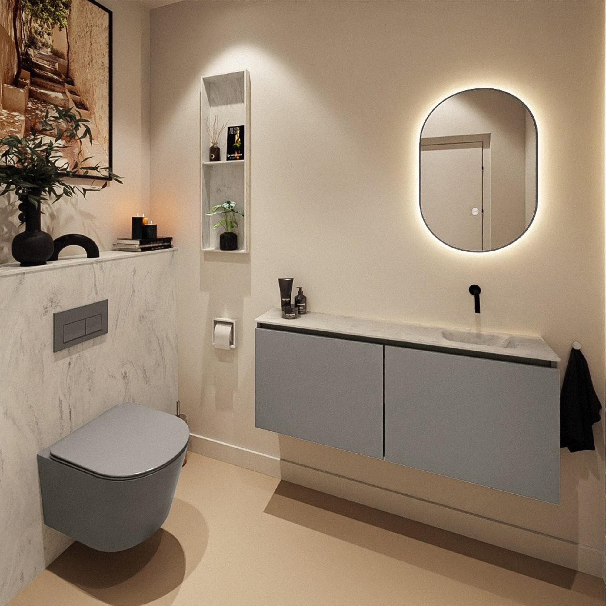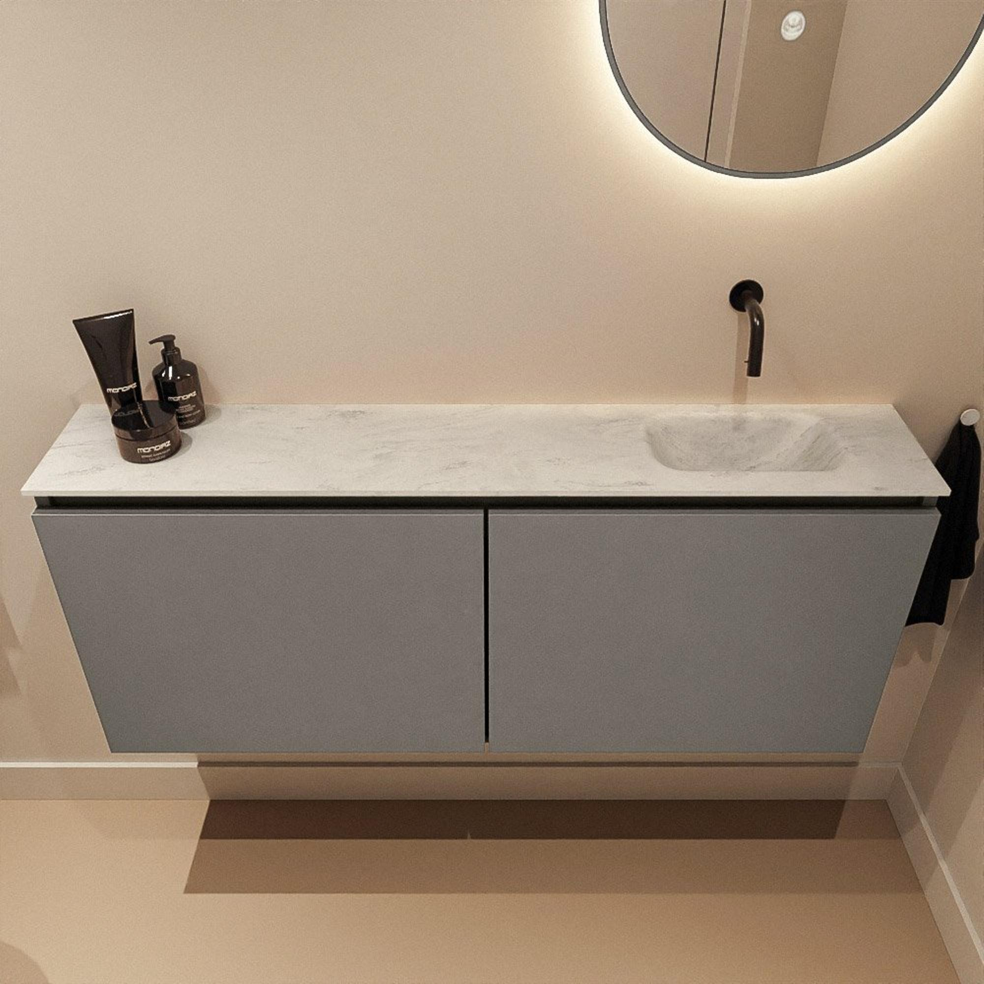 Avec une largeur de 120 cm et une profondeur de seulement 23 cm, ce meuble offre une allure généreuse sans empiéter excessivement sur l’espace. Idéal pour les WC étroits, une niche ou une petite salle de bains où l’espace de circulation est important. Les dimensions peu profondes garantissent un passage confortable, tout en vous offrant une vasque complète à disposition. Les deux portes offrent un espace de rangement pour les rouleaux de papier toilette, les serviettes invité et les produits d’entretien, de sorte que tout reste bien hors de vue et que vos toilettes aient toujours un aspect soigné. Grâce à la fixation murale, l’ensemble paraît en outre léger et flottant, ce qui agrandit optiquement la pièce et facilite grandement le nettoyage du sol.