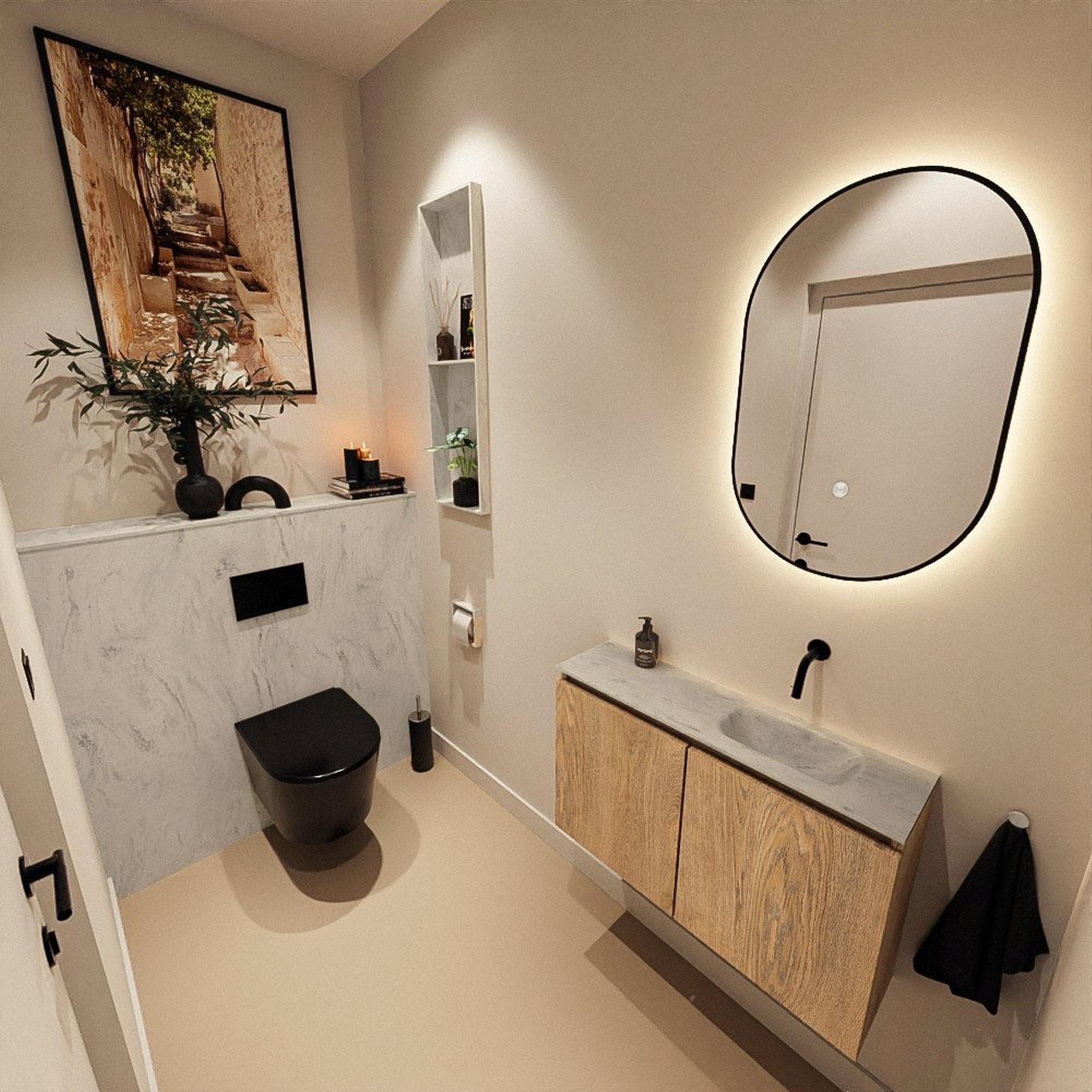Avec seulement 23 cm de profondeur, ce meuble est spécialement conçu pour les toilettes compactes et les petites salles de bains, où chaque centimètre compte. La largeur de 80 cm assure malgré tout une apparence généreuse et un espace de travail confortable autour du lavabo. Comme le lavabo est positionné à droite, vous pouvez planifier intelligemment l’agencement de votre pièce et, par exemple, conserver suffisamment d’espace de circulation ou de liberté de mouvement au niveau des toilettes. Les deux portes vous offrent un espace de rangement pratique pour les serviettes invité, les produits d’entretien ou les rouleaux de papier toilette, de sorte que tout reste bien hors de vue. Résultat : des toilettes dégagées et aérées qui paraissent plus grandes qu’en réalité.