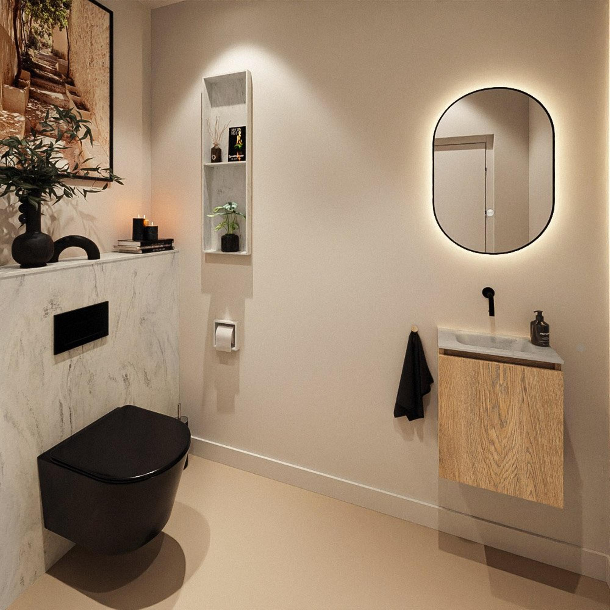 - Élégante apparence bois Washed Oak qui apporte chaleur et ambiance à vos toilettes
