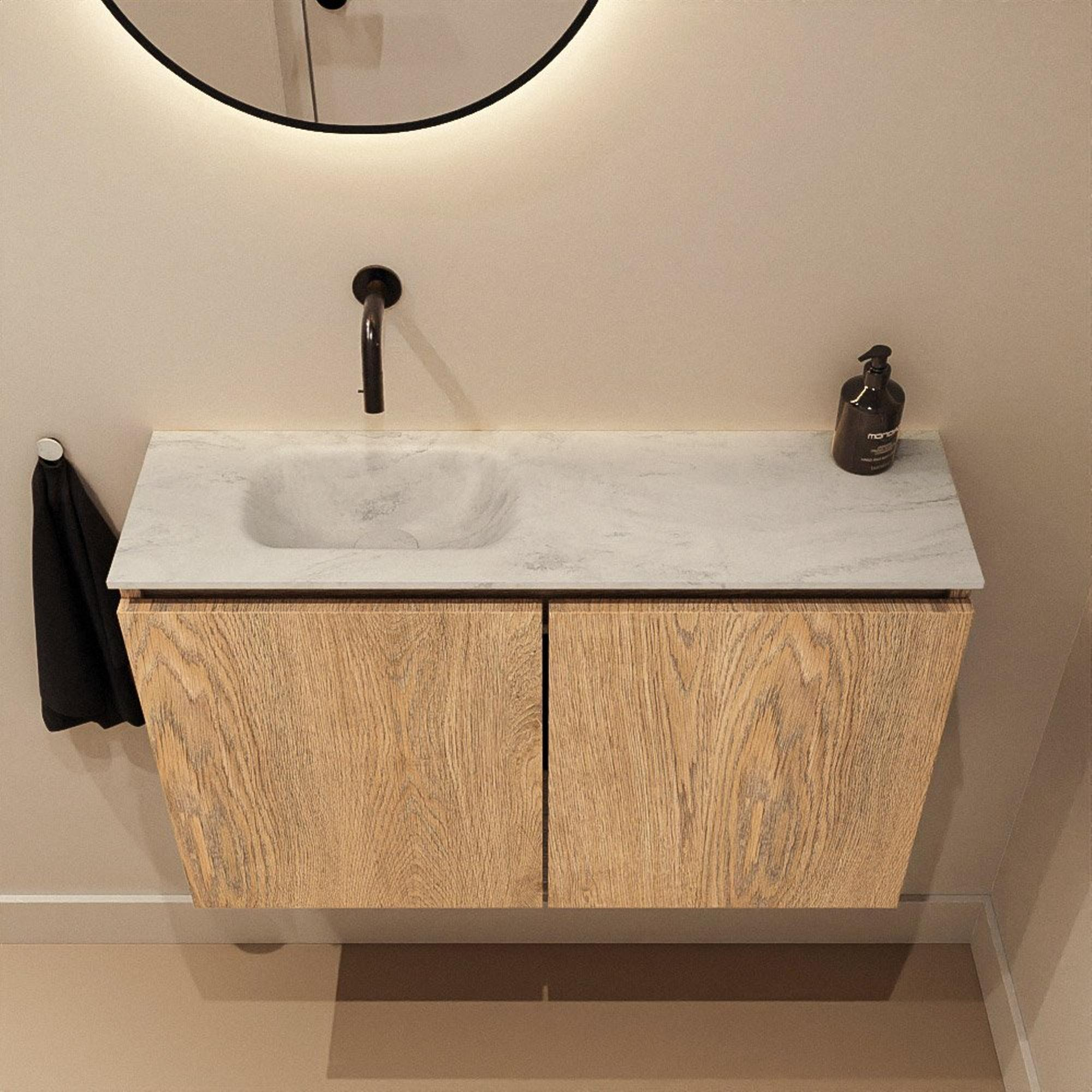 MONDIAZ TURE-DLUX Meuble WC 80 cm Washed Oak. EDEN vasque Opalo position gauche. Sans trou de robinet.