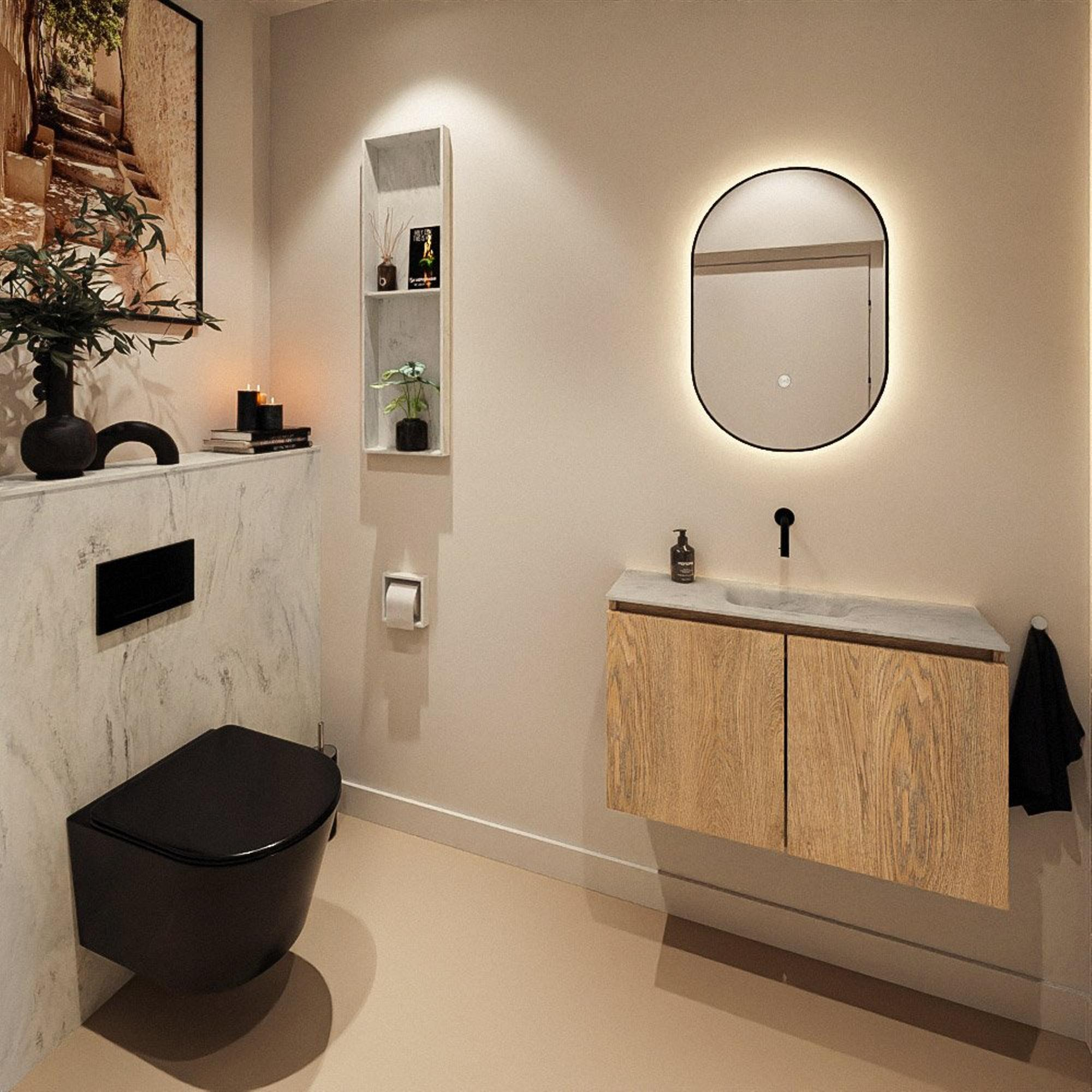 MONDIAZ TURE-DLUX meuble pour toilettes 80 cm Washed Oak. EDEN vasque Opalo position milieu. Sans trou de robinet.