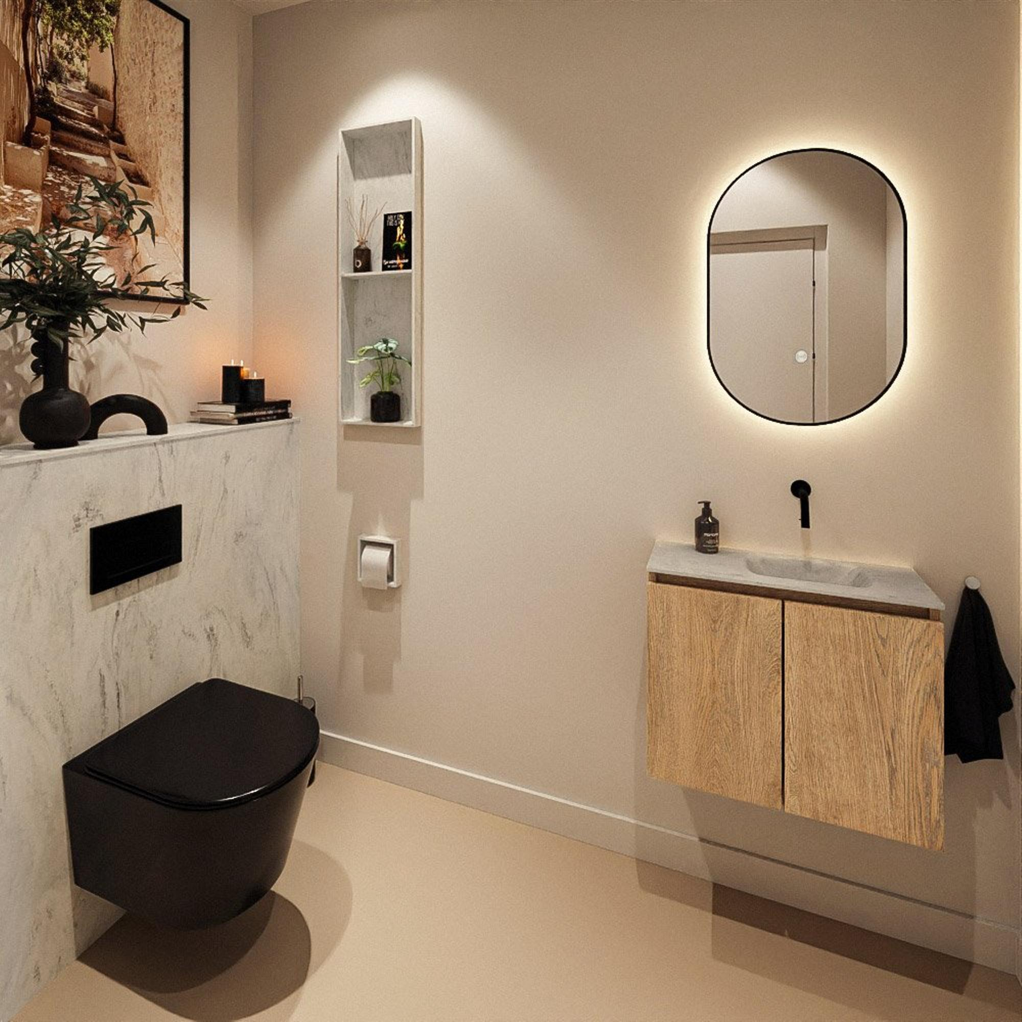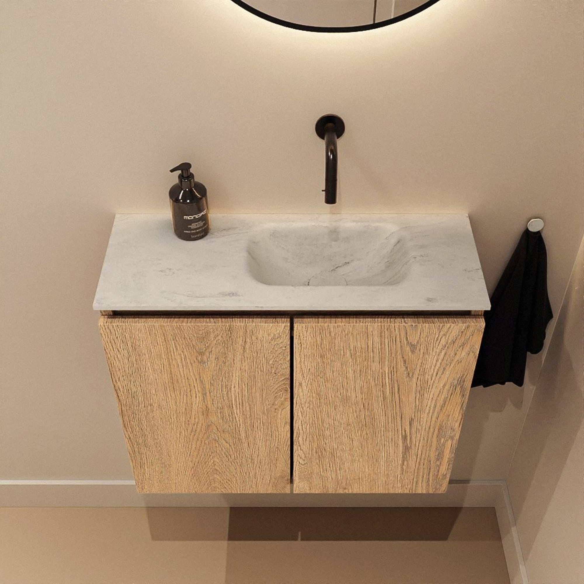 MONDIAZ TURE-DLUX meuble WC 60 cm Washed Oak. EDEN lavabo Opalo position droite. Sans trou de robinet.