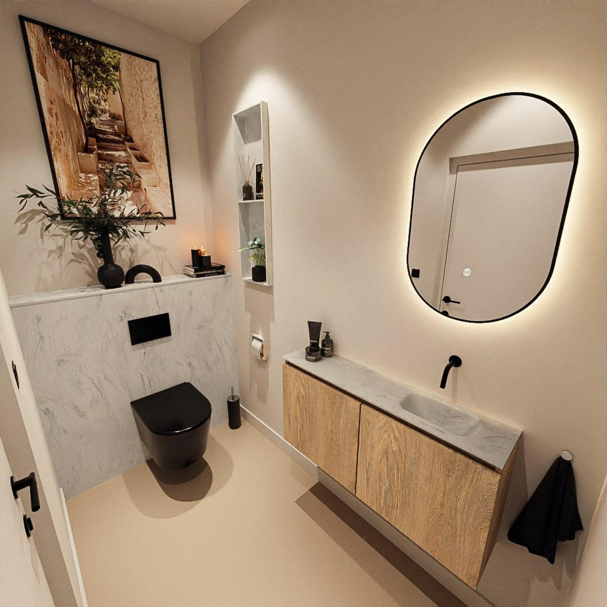 Le meuble est réalisé en mélamine, un matériau solide et stable, très résistant à une utilisation quotidienne dans les toilettes. Les éclaboussures d’eau, les mains humides ou une serviette invité mouillée ne posent aucun problème et s’essuient rapidement avec un chiffon doux. La teinte bois reste belle, même en cas d’usage intensif, ce qui vous permet de profiter longtemps du même aspect soigné. Le plan en solid surface et le lavabo assorti en version Opalo (avec un subtil aspect marbre) sont lisses et denses, ce qui facilite le nettoyage. Grâce au design sans poignées, vous n’avez pas de poignées saillantes auxquelles vous pourriez vous accrocher et vous créez un ensemble épuré et minimaliste, également pratique pour l’essuyage des façades.