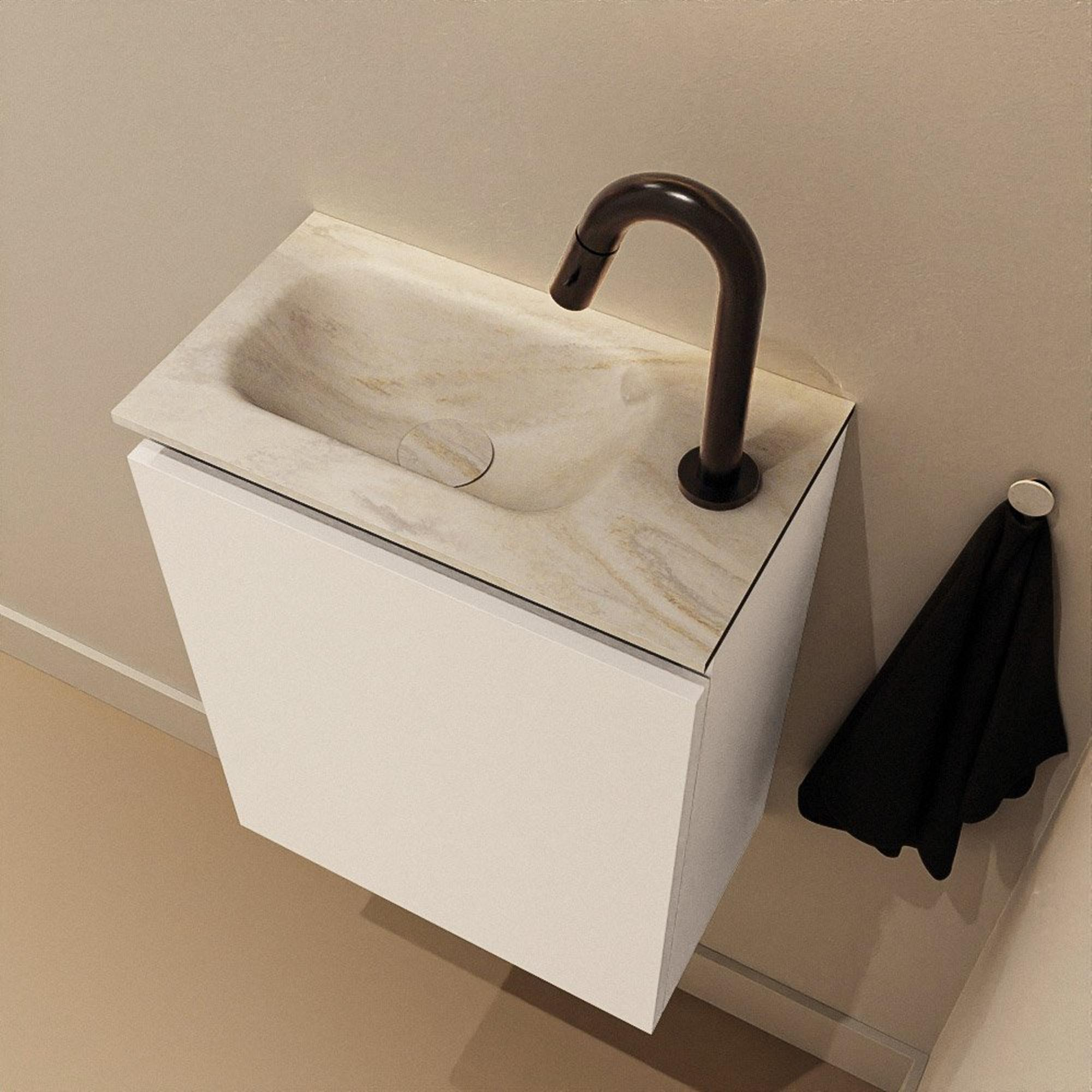 Vous recherchez un meuble compact mais élégant pour apporter une touche de luxe supplémentaire à vos toilettes ou à votre petite salle de bains ? Alors ce meuble de toilettes élancé avec lavabo solide est un choix judicieux. Grâce à sa faible profondeur, il s’intègre parfaitement dans les petits espaces ou les passages étroits, tout en offrant un véritable point d’eau avec robinet. La subtile couleur talc du meuble forme une base apaisante, qui se combine aisément avec des styles modernes, scandinaves ou minimalistes. La douce teinte crème du lavabo crée un contraste raffiné, donnant à l’ensemble un aspect chaleureux et accueillant. Avec la vasque à gauche et le trou de robinet sur cette même position, ce modèle est idéal si vous souhaitez, par exemple, créer juste à côté de la porte ou près des toilettes un point d’eau pratique et ergonomique pour vous laver les mains, sans que le meuble ne s’avance trop dans la pièce.