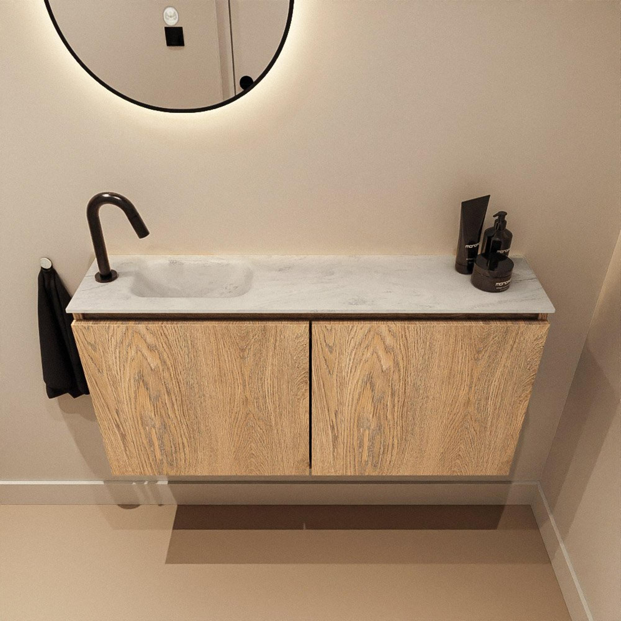 MONDIAZ TURE-DLUX meuble de toilettes 100cm Washed Oak. EDEN lavabo Opalo position gauche. Avec 1 trou de robinet.