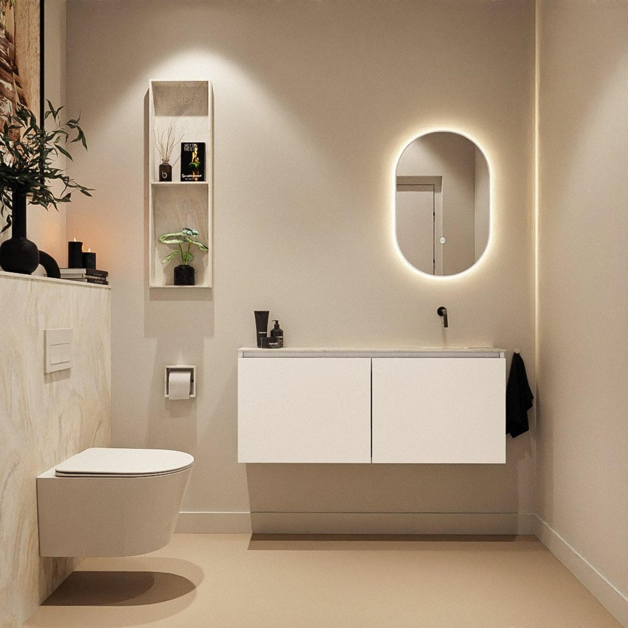 Le meuble est fabriqué en MDF et fini dans la couleur Talc, une teinte douce et moderne qui se marie facilement avec des accessoires clairs comme foncés. La façade sans poignées offre une allure ultra épurée : aucun bouton ni poignée saillante, uniquement des surfaces planes et calmes qui ne font qu’un avec le plan vasque. Cela rend ce meuble particulièrement adapté si vous aimez les salles de bains au design minimaliste ou le style hôtel chic aux lignes sobres. De plus, le style moderne s’accorde parfaitement avec des robinetteries et accessoires noirs, en métal brossé ou en inox, de sorte que vous pouvez choisir votre propre couleur d’accent et éventuellement la changer plus tard sans que le meuble ne détonne.