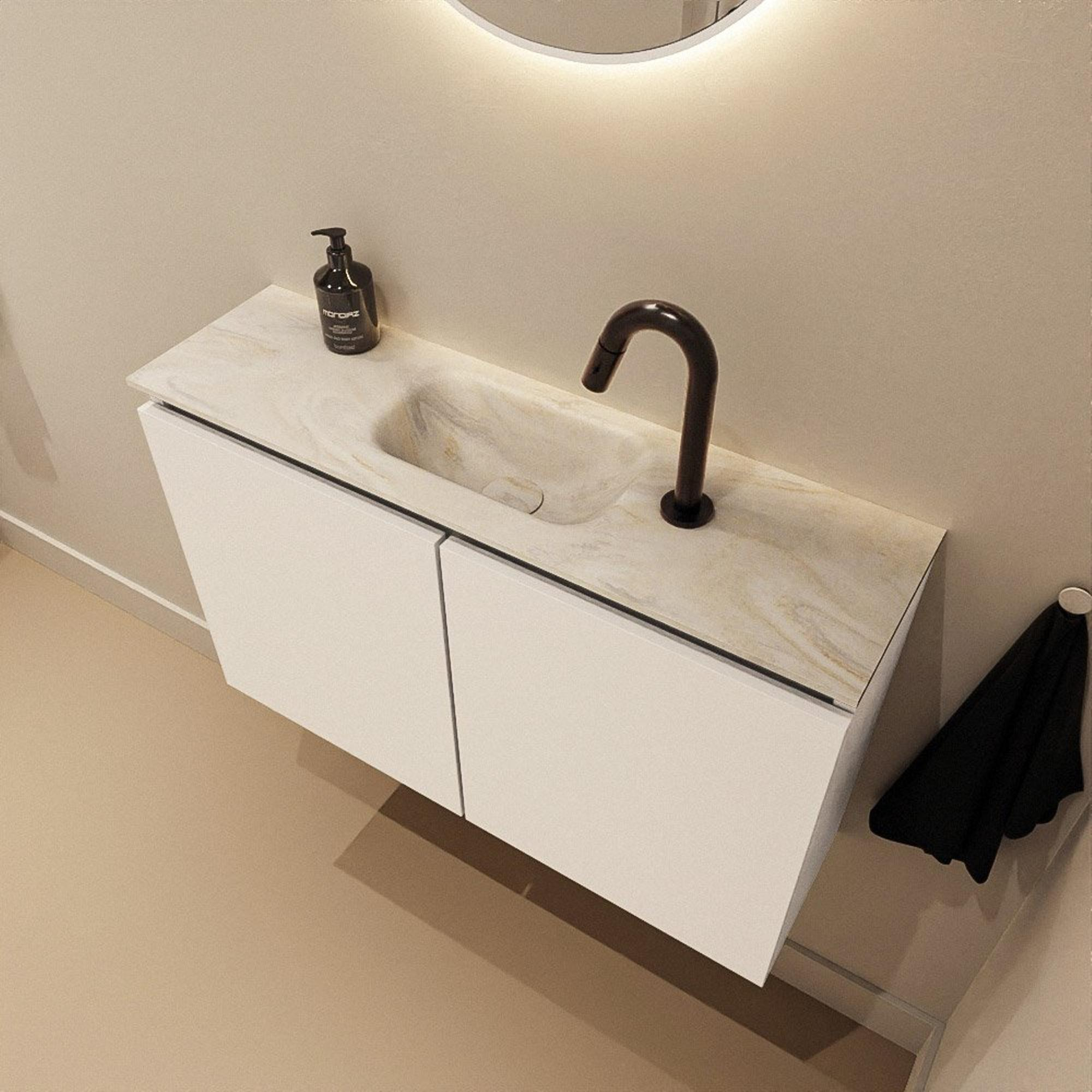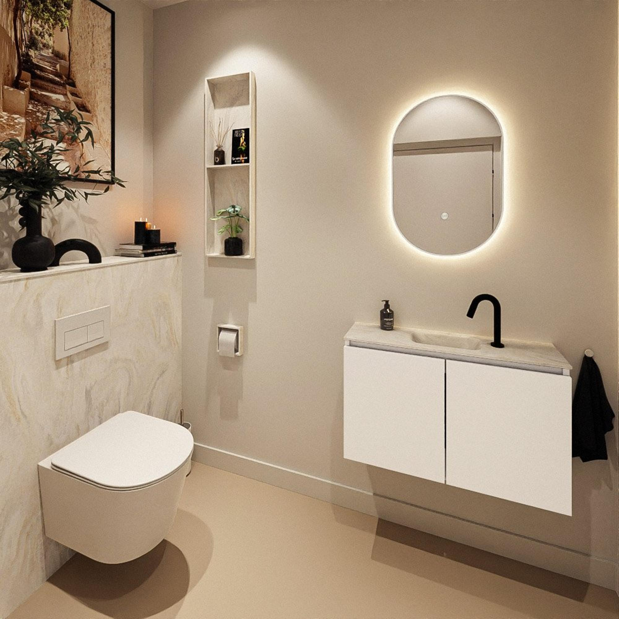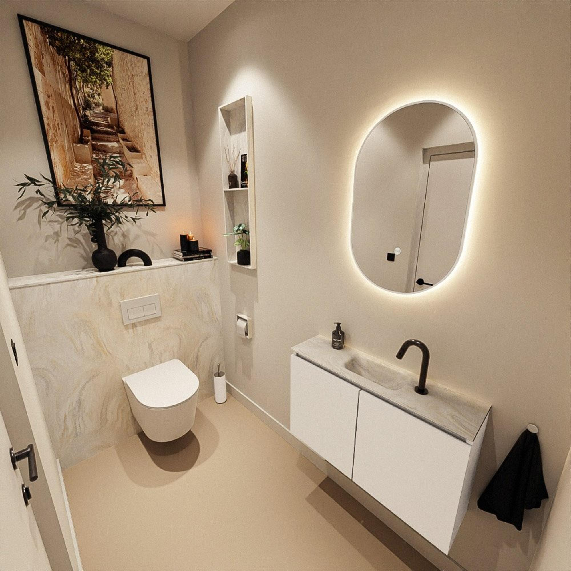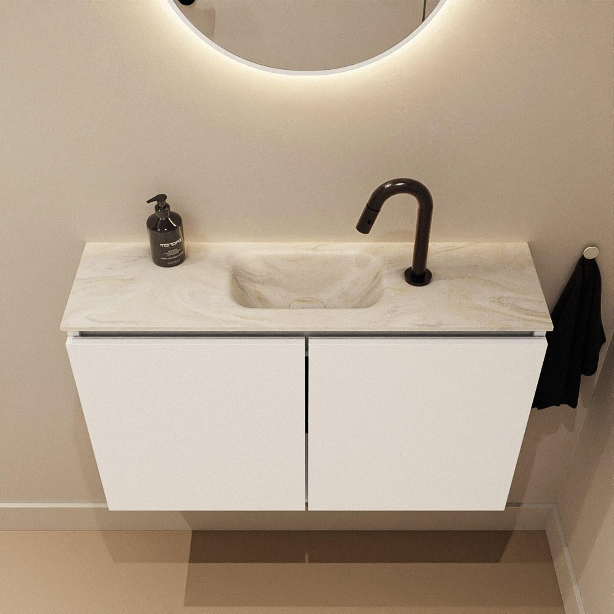 Ce meuble WC compact de 80 cm de largeur est idéal si vous recherchez une solution élégante et fonctionnelle pour un espace toilettes, une petite salle de bains ou une niche étroite. Grâce à sa faible profondeur, vous conservez suffisamment d’espace de circulation, tout en disposant d’un véritable lavabo avec espace de rangement. La combinaison d’un meuble moderne de couleur Talc et d’un élégant lavabo en solid surface dans la teinte Ostra offre un aspect calme et luxueux qui s’accorde parfaitement avec des salles de bains modernes, scandinaves ou de style hôtel chic. Avec le trou de robinet au milieu et la cuve intégrée, vous pouvez facilement y installer un robinet de votre choix. Vous créez ainsi une solution pratique, hygiénique et très esthétique pour un usage quotidien, même lorsque l’espace est limité.