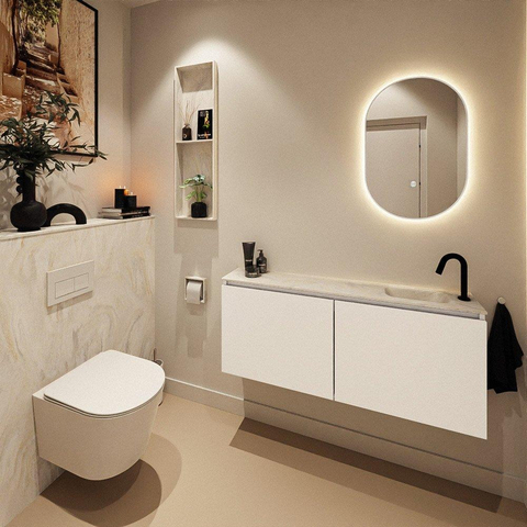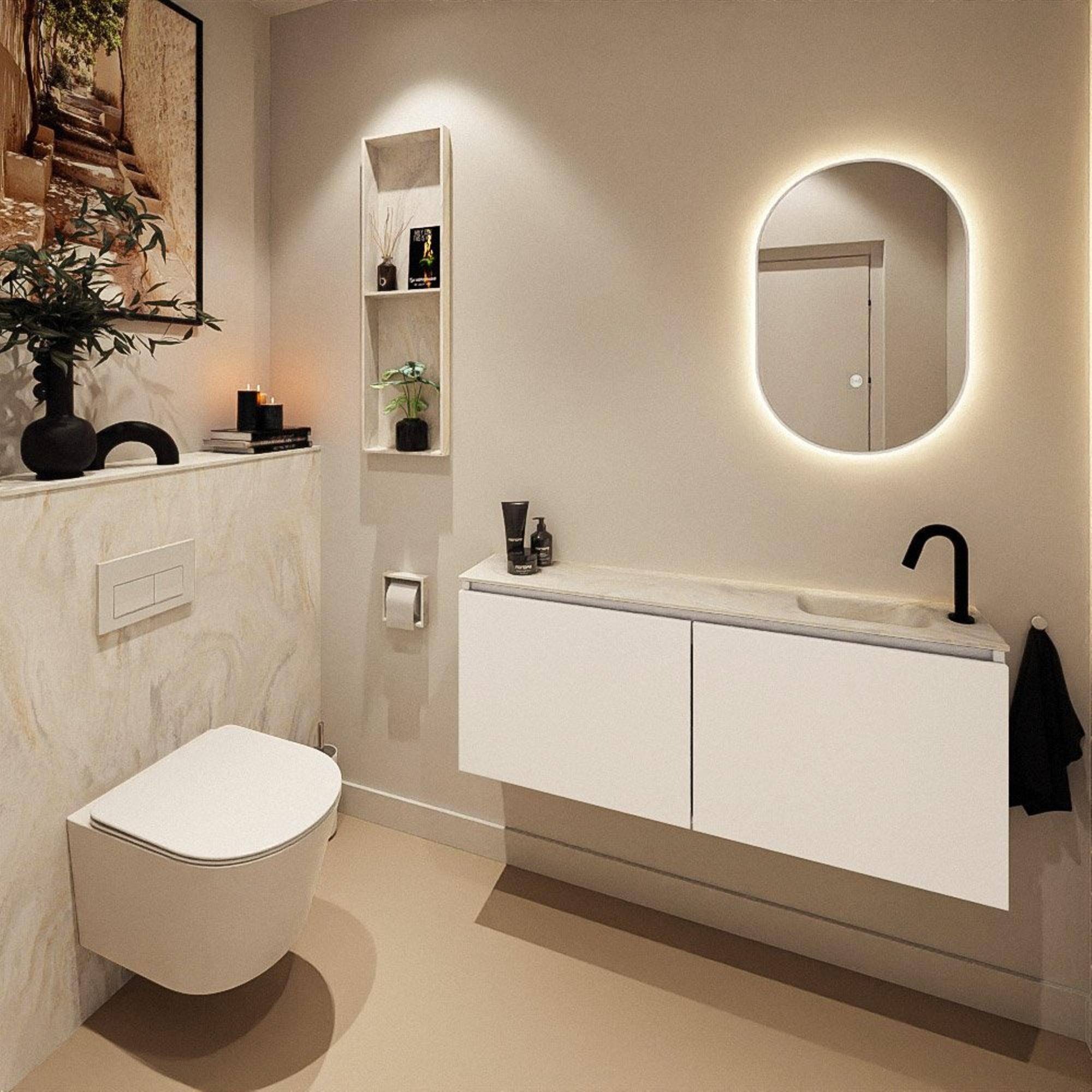 La teinte claire Talc du meuble forme une base douce et contemporaine qui se marie parfaitement avec la céramique blanche, les carreaux clairs et les matériaux naturels tels que le bois ou l’effet béton. La vasque EDEN en coloris Ostra s’y ajoute harmonieusement avec un aspect moderne et robuste dans une palette de tons crème/blanc. Ensemble, cette combinaison offre un look luxueux mais discret : exactement ce qu’il faut pour des toilettes modernes ou design. Les façades sans poignées renforcent les lignes épurées et apportent une apparence visuellement calme. Ainsi, même un petit WC bénéficie de l’allure d’un espace soigneusement conçu.