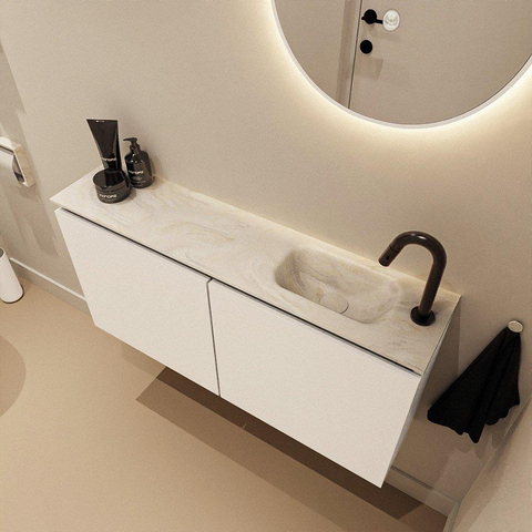 Avec une profondeur de seulement 23 cm, ce meuble est une solution idéale pour les petits WC ou les salles de bains étroites où chaque centimètre compte. Vous pouvez passer confortablement devant le meuble sans avoir l’impression que l’espace est encombré, tout en profitant d’une solution de lavabo complète. La largeur de 100 cm vous offre en plus suffisamment d’espace de plan de toilette pour poser, par exemple, un distributeur de savon, une bougie parfumée ou des accessoires, sans que cela ne paraisse désordonné. En plaçant le lavabo à droite, ce meuble est particulièrement adapté si votre arrivée d’eau ou le sens de circulation l’exige, afin que vous tiriez le meilleur parti de l’espace disponible.