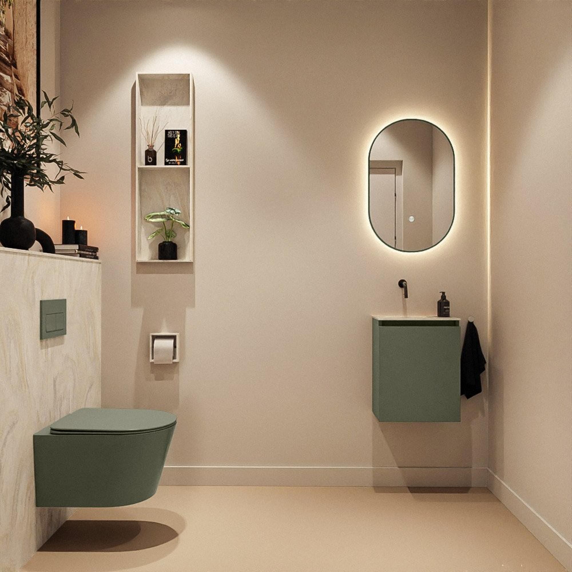 Ce meuble de toilettes compact de 40 cm de large est idéal pour l’aménagement moderne d’un espace WC ou d’une petite salle de bains, où chaque centimètre compte mais où vous ne souhaitez faire aucune concession sur le style. Ses dimensions fines permettent au meuble de trouver parfaitement sa place même dans des niches étroites ou derrière une porte s’ouvrant vers l’intérieur, tandis que la combinaison du plan de lavabo crème apaisant et de la couleur Army du meuble crée une ambiance raffinée et moderne. Grâce au montage posé et au lavabo intégré, vous créez un look net et ordonné, parfait si vous aimez le design minimaliste avec une touche chaleureuse. Ce meuble convient particulièrement si vous recherchez un meuble lave-mains fonctionnel offrant un confort d’utilisation suffisant, mais sans robinet visible, par exemple parce que vous optez pour un robinet encastré ou mural. Vous transformez ainsi un petit WC en un espace réfléchi et haut de gamme.
