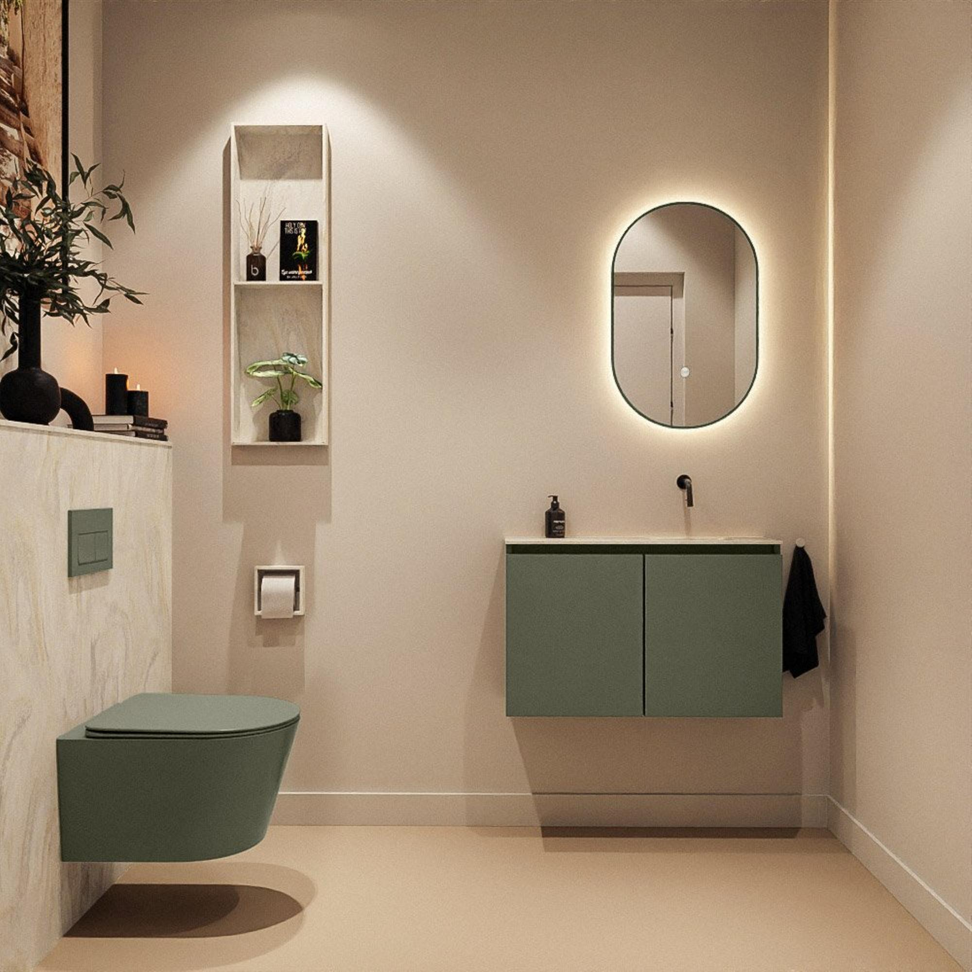La couleur vert army profonde du meuble forme un superbe contraste avec le plan de lavabo en solid surface crème de la série Eden dans la teinte Ostra, avec un raffiné aspect marbre. Cela confère immédiatement à vos toilettes une apparence haut de gamme et axée sur le design. Les façades modernes sans poignées s'intègrent parfaitement à un style minimaliste : lignes épurées, aucun détail superflu et un ensemble sobre. La couleur crème neutre du lavabo se combine en outre facilement avec différents coloris de carrelage, des robinets en laiton, noirs ou chromés et d'autres accessoires de salle de bains. Vous pouvez ainsi facilement donner à vos toilettes une touche scandinave lumineuse, hôtel chic ou au contraire industrielle moderne, tandis que le meuble lui-même forme une base intemporelle.