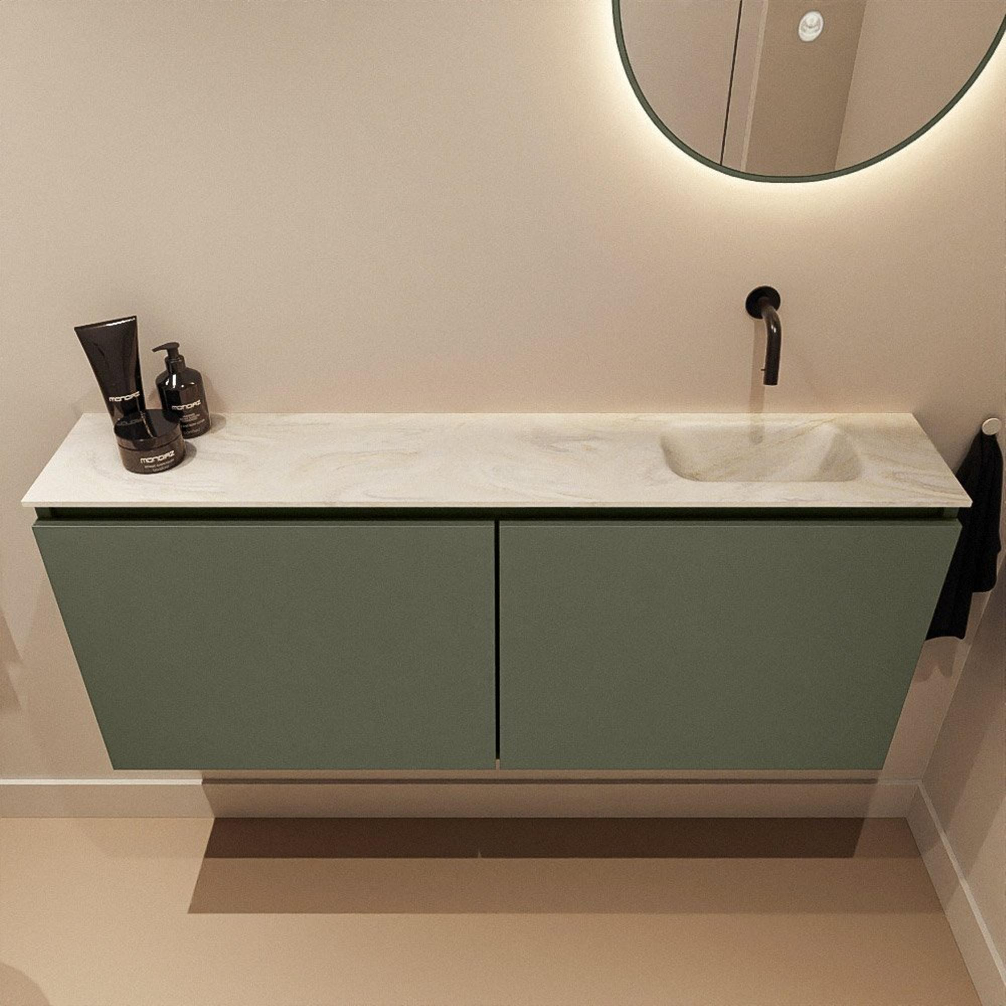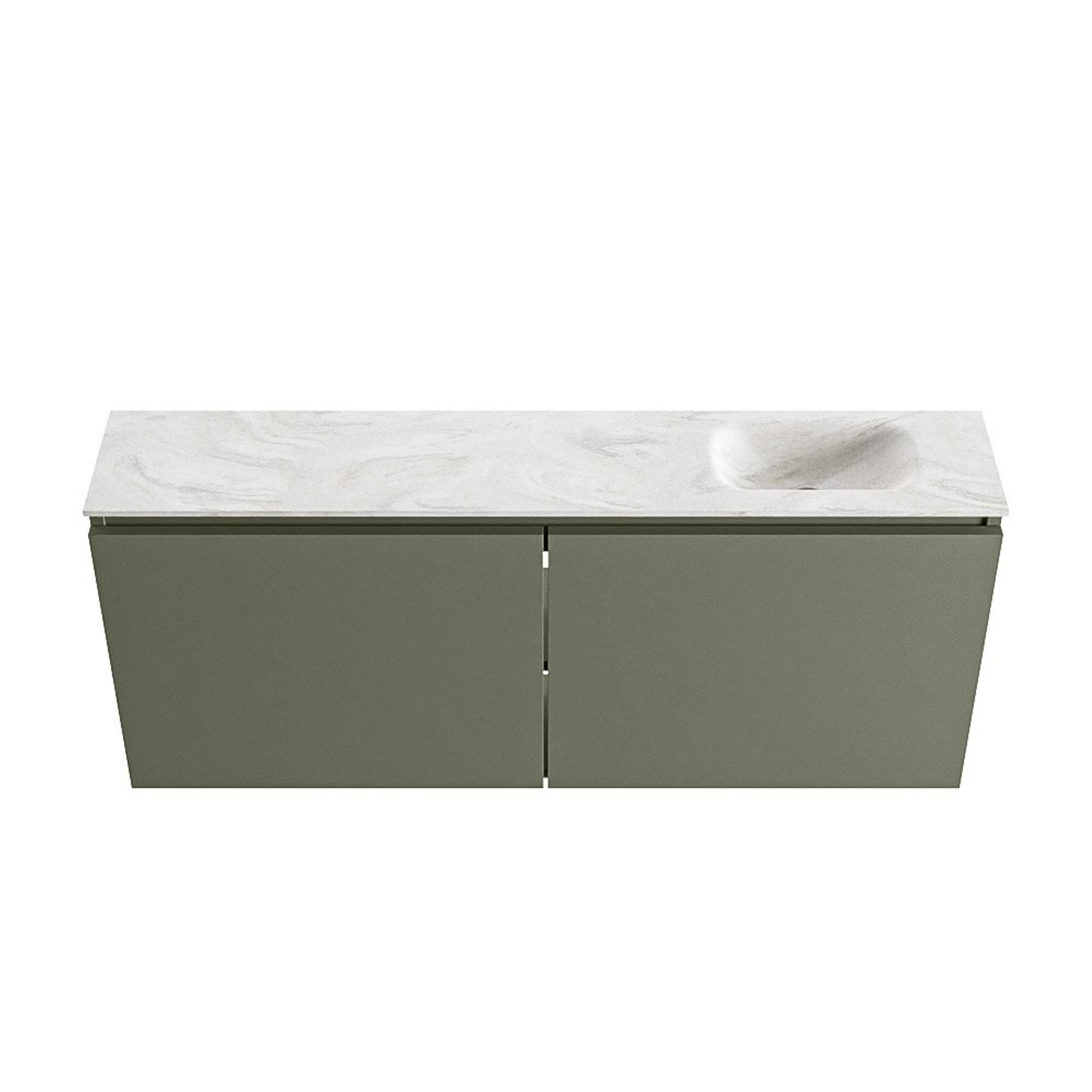 MONDIAZ TURE-DLUX Meuble de toilettes 120 cm Army. Lavabo EDEN Ostra position droite. Sans trou de robinet.