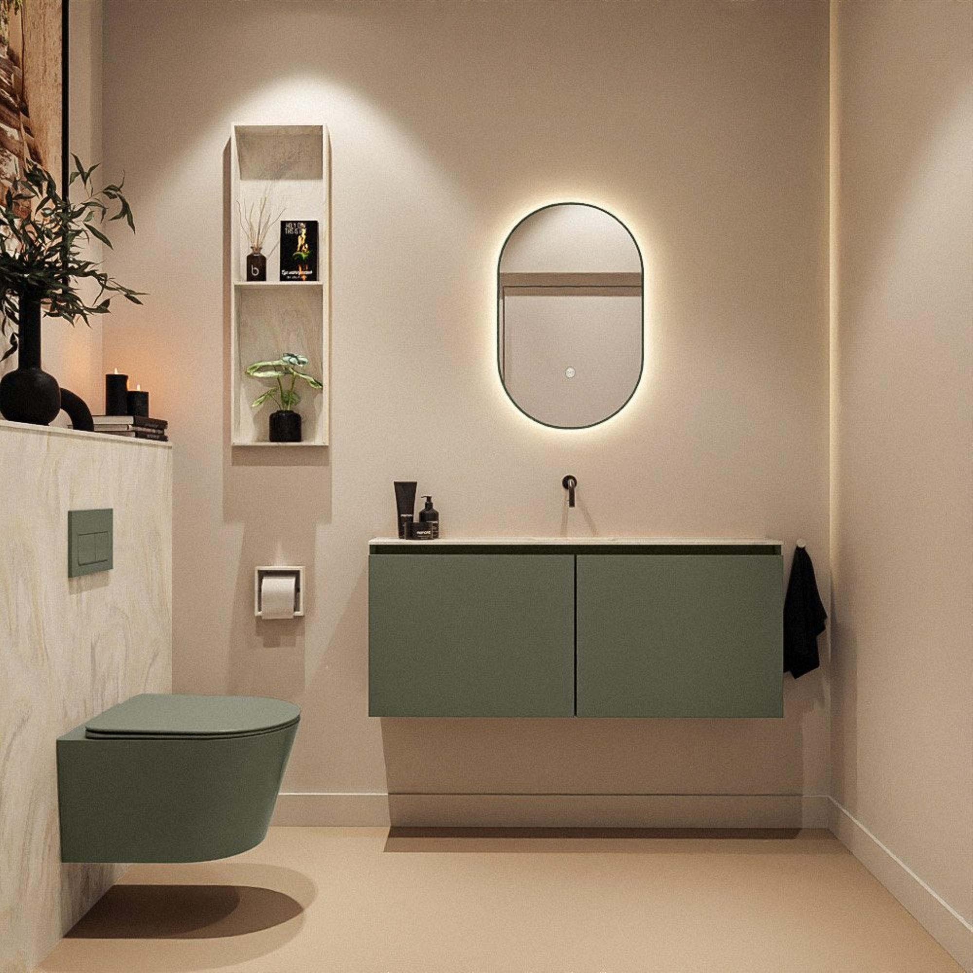Avec une largeur de 120 cm et une faible profondeur de 23 cm, ce meuble offre un plan généreux et un lavabo à part entière, sans occuper beaucoup d’espace. Cela le rend particulièrement adapté aux toilettes étroites, salles de bains allongées ou à une niche où il est autrement difficile de trouver un meuble adapté. Les façades sans poignées créent un jeu de lignes horizontales épurées qui s’intègre parfaitement dans un style d’intérieur moderne. La couleur Army confère au meuble un look contemporain, presque digne d’un hôtel design, tandis que le lavabo couleur crème adoucit visuellement l’ensemble. Comme la vasque est positionnée au centre, il reste de la place à gauche et à droite pour du savon, un diffuseur de parfum ou un bel ensemble d’accessoires, sans que cela ne paraisse désordonné.