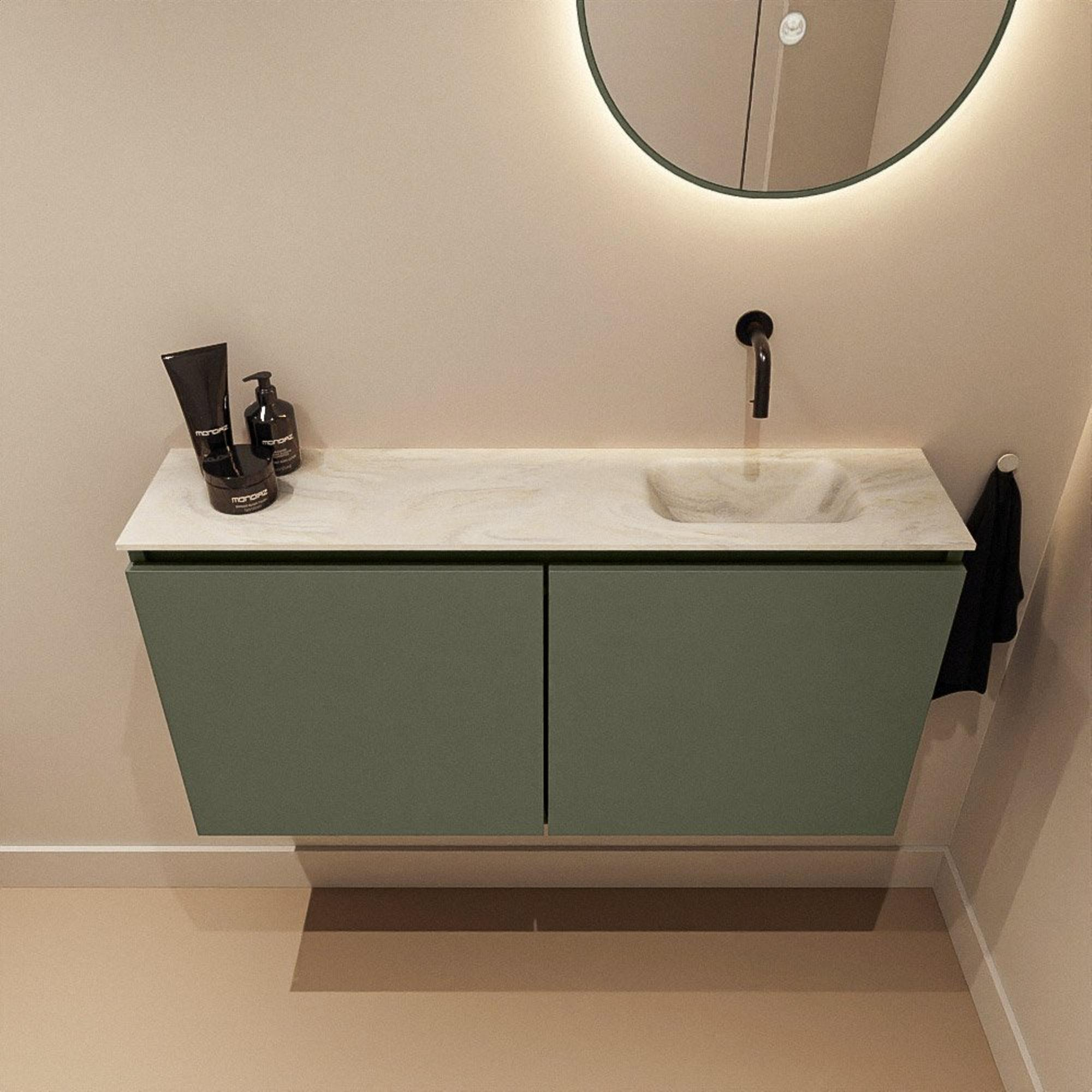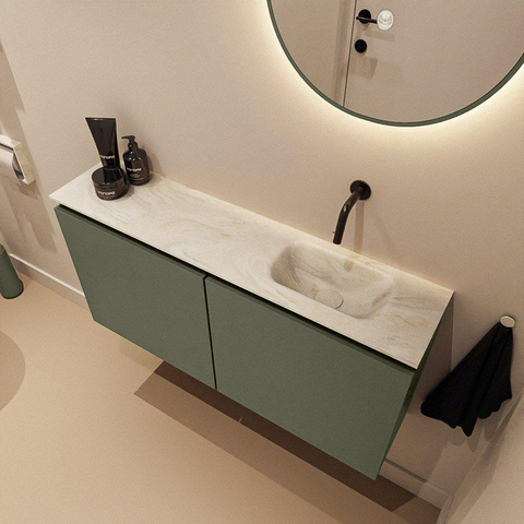 - Meuble dans une couleur Army tendance, parfaitement combinable avec des robinets et accessoires noirs, en laiton ou en inox.