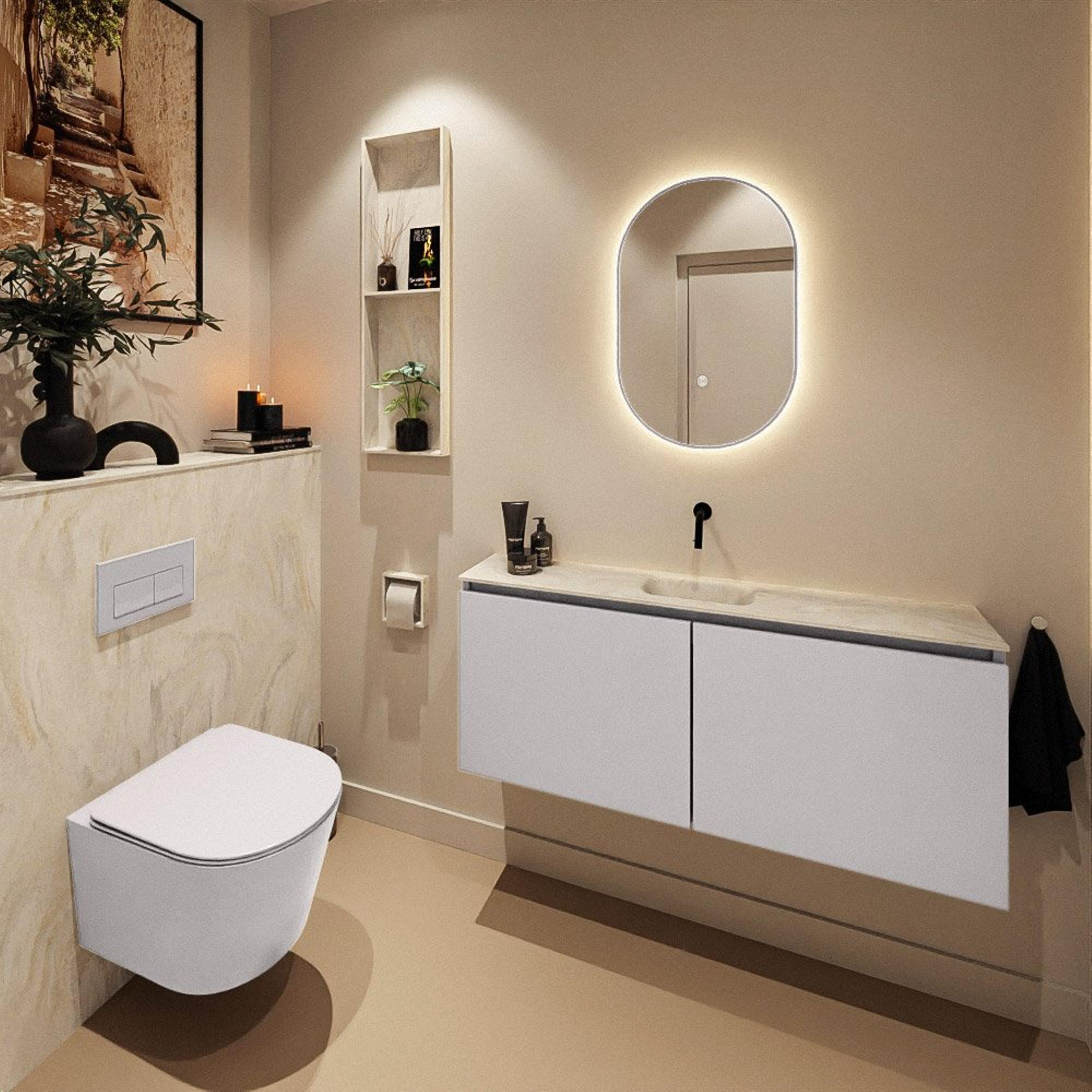 Avec ce meuble WC moderne, vous créez en une seule fois une solution soignée et bien pensée pour votre espace toilettes ou votre petite salle de bains. La largeur généreuse de 120 cm vous offre une allure luxueuse et suffisamment d'espace sur le plan, tandis que la faible profondeur du meuble permet justement de gagner de la place dans les espaces plus étroits ou dans un couloir étroit menant aux toilettes. La combinaison d'un meuble fin avec un lavabo Solid Surface dans une douce couleur crème rend l'ensemble à la fois élégant et confortable à l'usage quotidien. Grâce au design épuré et à la finition sans poignée, ce meuble s'intègre parfaitement dans les intérieurs modernes, mais aussi dans les salles de bains calmes et intemporelles que vous aimez garder minimalistes et ordonnées. Si vous recherchez une solution élégante sans trou de robinet, par exemple parce que vous souhaitez utiliser un mitigeur encastré ou un robinet mural, cet ensemble est alors un choix particulièrement adapté.