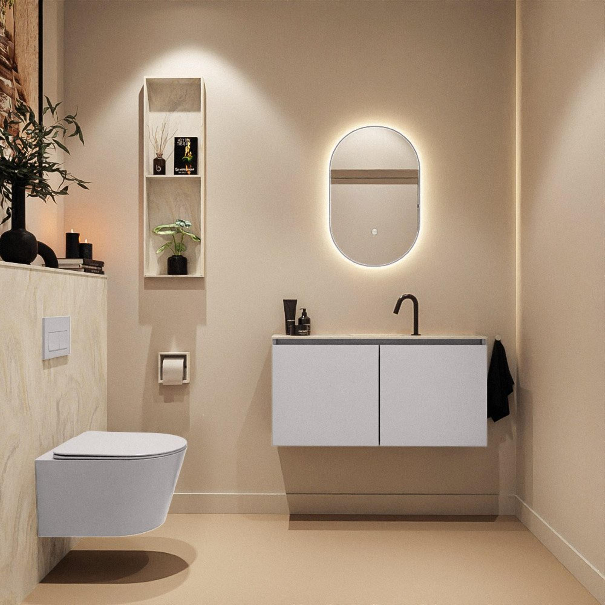 La couleur gris moderne Cale donne au meuble une base contemporaine et apaisante qui se marie facilement avec des carreaux blancs, couleur sable ou au contraire foncés. Le lavabo couleur crème Eden Ostra en solid surface y ajoute une touche chaleureuse, presque digne d’un hôtel. Ensemble, cette combinaison offre un look luxueux sans être tape-à-l’œil, parfait si vous souhaitez un design intemporel dont vous profiterez pendant des années. La finition sans poignées renforce le caractère minimaliste et permet au panneau frontal de rester parfaitement lisse et uniforme. Le meuble forme ainsi un ensemble élégant avec le reste de votre sanitaire, que vous optiez pour des robinets et accessoires noirs, chromés ou en métal brossé.