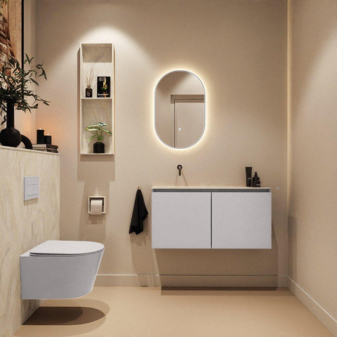 La combinaison du meuble Cale dans une gamme de tons de gris modernes avec le lavabo Ostra de couleur crème crée un contraste subtil à la fois chaleureux et contemporain. La palette de couleurs apaisante se marie facilement avec les tendances de carrelage populaires, comme l’effet béton, le terrazzo ou les carreaux muraux blancs. Le plan et le lavabo en solid surface présentent un aspect mat haut de gamme qui confère immédiatement une ambiance luxueuse, même dans un petit espace WC. Vous créez ainsi avec un seul meuble un élément phare élégant qui fait passer vos toilettes ou votre salle de bains d’appoint à un niveau supérieur.