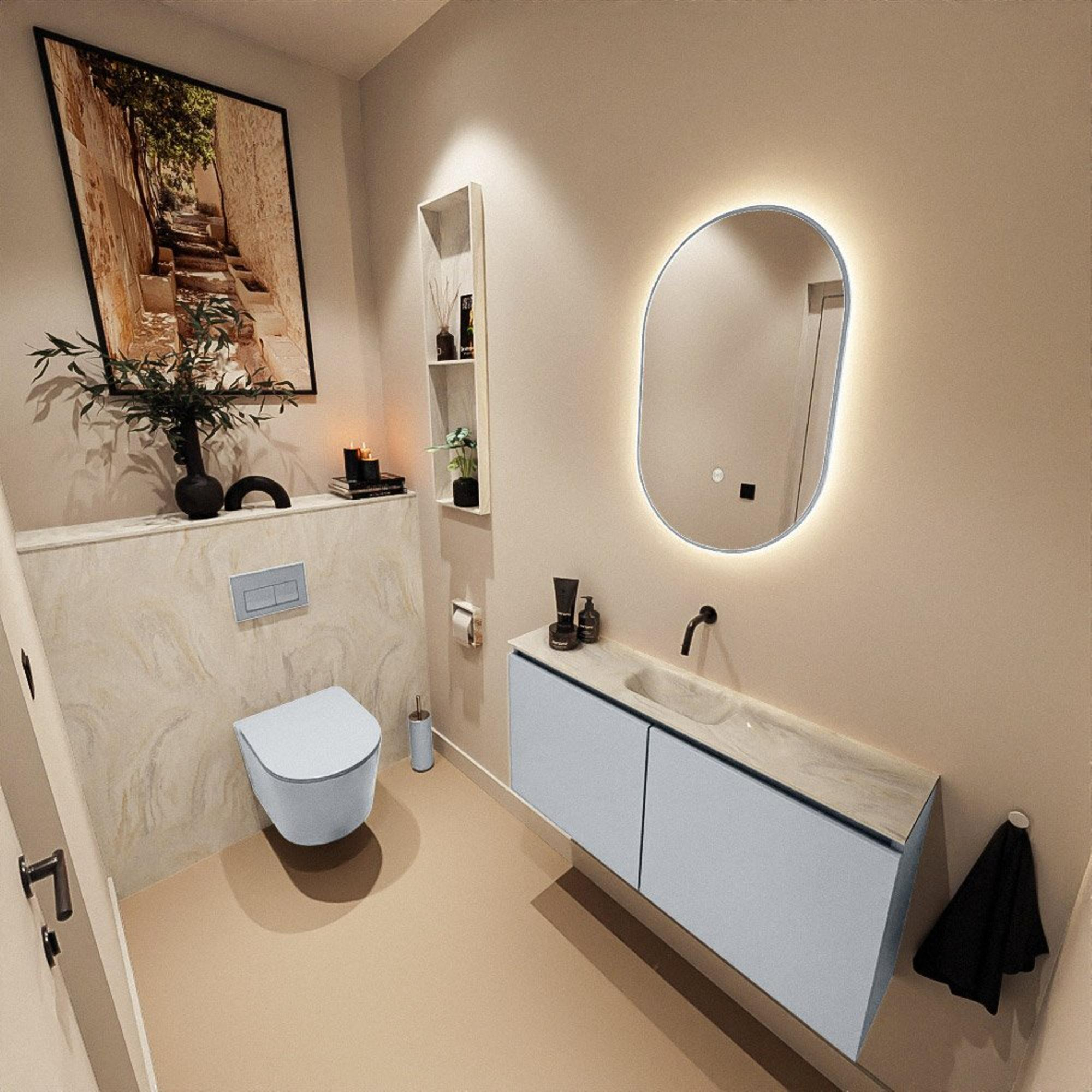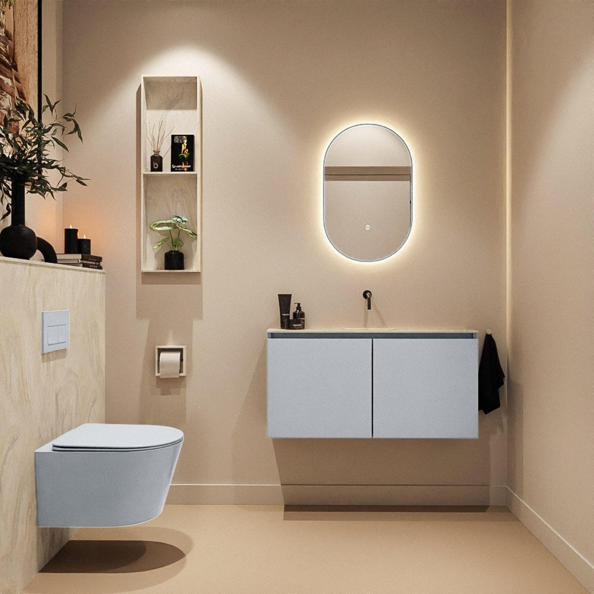 La douce teinte Clay du meuble forme une base chaleureuse et moderne qui s’harmonise parfaitement avec différents types de carrelages et de couleurs de sanitaire. Le plan en solid surface de couleur crème s’y associe à la perfection et crée un ensemble sobre et haut de gamme. Cette combinaison paraît luxueuse sans être criarde, ce qui donne immédiatement à vos toilettes ou à votre petite salle de bains une allure raffinée. En optant pour une telle combinaison de couleurs intemporelle, vous augmentez en outre les chances que le meuble reste en accord pendant des années avec l’évolution de vos styles d’intérieur et de vos accessoires. Ajoutez-y un robinet encastré ou posé assorti au mur et vous créez facilement un ensemble harmonieux.